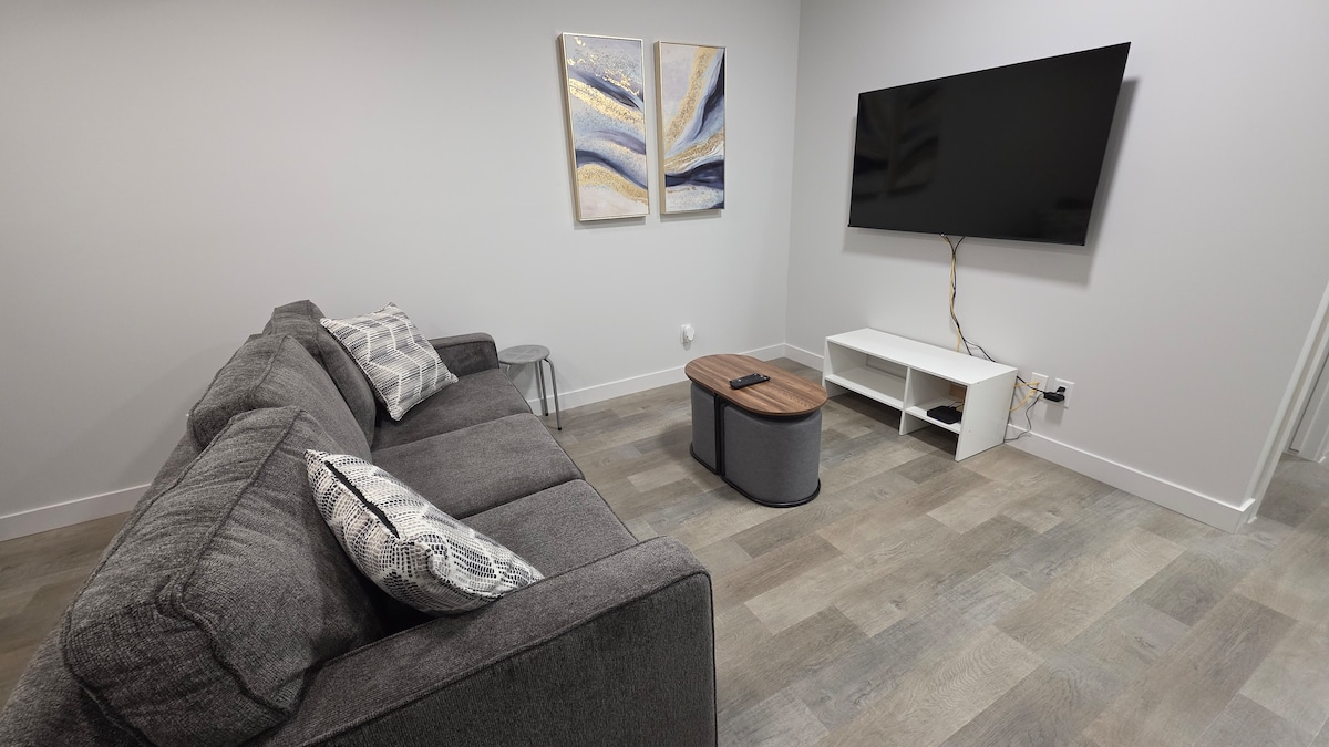 Modern & comfortable, private side entry basement unit with AC! Exclusive access to 1 bedroom with a brand new Queen size Endy mattress, kitchenette fully equipped, living room with smart tv, Alexa speaker, and parking. Walking distance to grocery stores, movie theatre, liquor stores, restaurants, bars, the biggest YMCA in the world, and a public library Banff: 154Km (1h 45m) Downtown: 30Km (25 min) Airport: 40Km (28m) Canmore: 130Km (1h 27m)