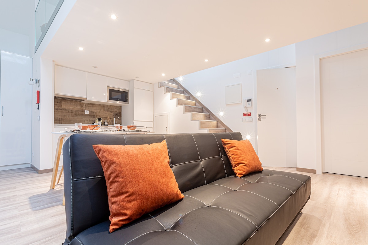 This one bedroom spacious loft just gives you a sensation of relaxation and light. At the second top floor of the only so called Dutch Building in Setúbal this apartment is perfectly located to explore the area. The white interior balanced by soft colours, wooden flooring and inflowing light triggers a feeling of well being and the casual urban style creates a sense of updated comfort, crowned by the unique view of the quaint local square that invokes the fisher village Setúbal once was.