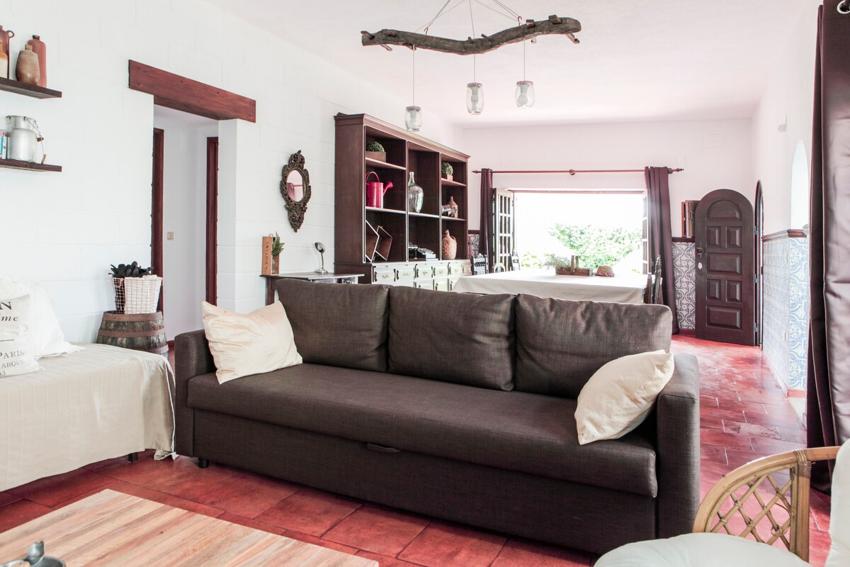Casal dos Gansos is a c. 5000m2 family farm in the parish of Quinta do Anjo (Palmela), 15 km from the beautiful beaches of the Arrábida Natural Park and 35 km from the centre of Lisbon. The cottage has a private garden (c. 400m2) where you can rest, listen to the birds, enjoy the view to the hill, work or read, quietly. The wine route of the Setúbal Peninsula and the shops selling artisanal sweets and cheeses (Azeitão) offer memorable sensory experiences, but there's much more to see and enjoy.