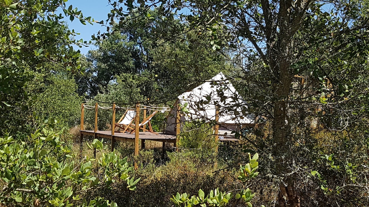 软木橡树林中的舒适钟形帐篷