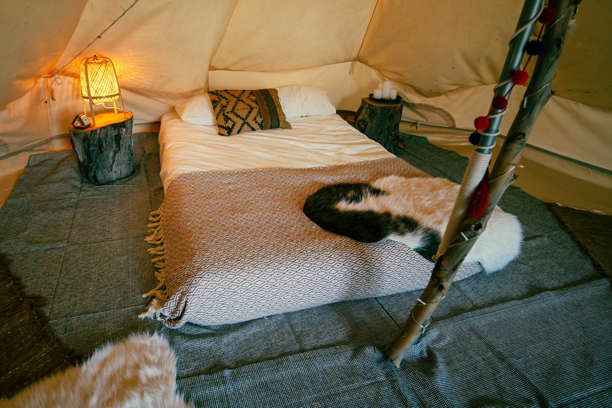 Come visit our little community and self-sufficient farm, whilst staying in a large tent made of natural fibres, situated next to our yoga dome and organic veggie garden. Experience camping with the luxuries of a hot shower and toilets, including access to a fully equipped kitchen and chill out lounge. (Please note, these are shared facilities). We are within walking distance of the historic medieval city of Alcácer do Sal, & only 20 minutes from Portugal's trendiest beach.