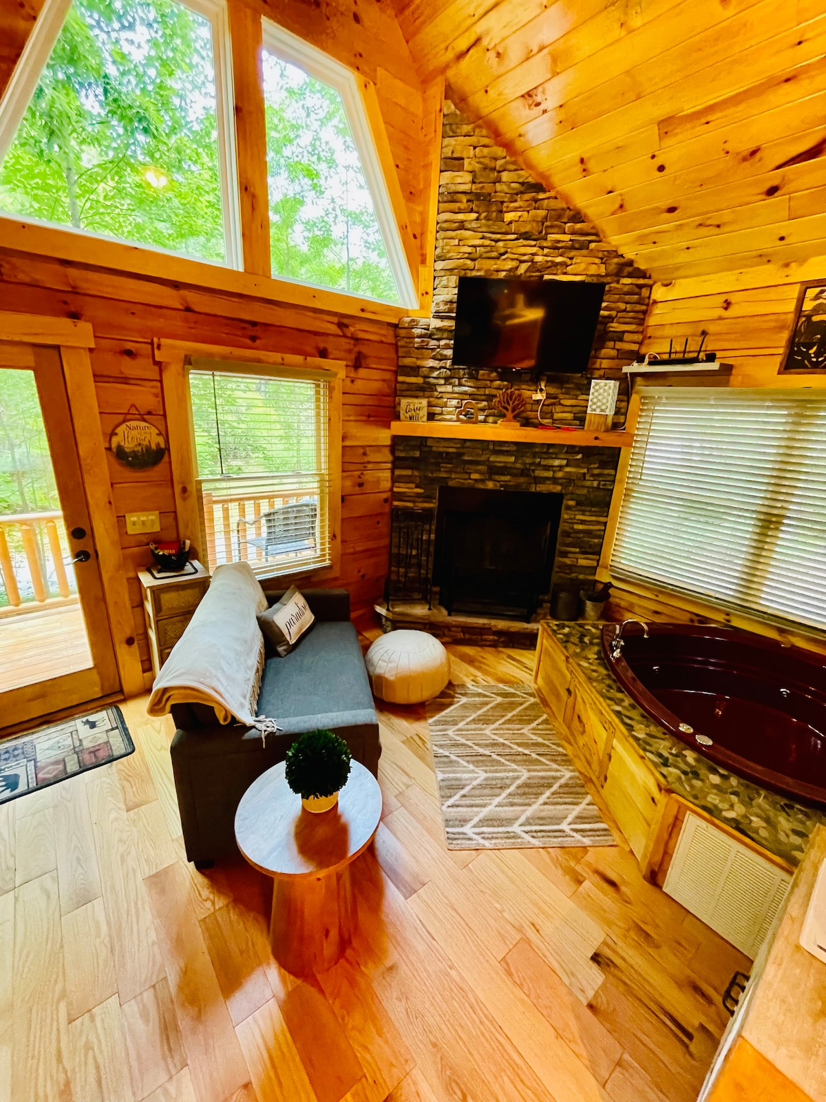 A true cozy log cabin located in the heart of the smokies 7 miles from the center of Pigeon Forge. Relax and enjoy the real wood burning fireplace on a cool night or enjoy the peaceful fire pit on our beautiful 3/4 acre wooded lot. Watch wildlife from the wraparound deck with a lovely pond view where you can fish. The hot tub awaits after a long day of enjoying the smokies! For a final special touch enjoy the beautiful romantic heart tub. This little cabin is a perfect romantic escape.