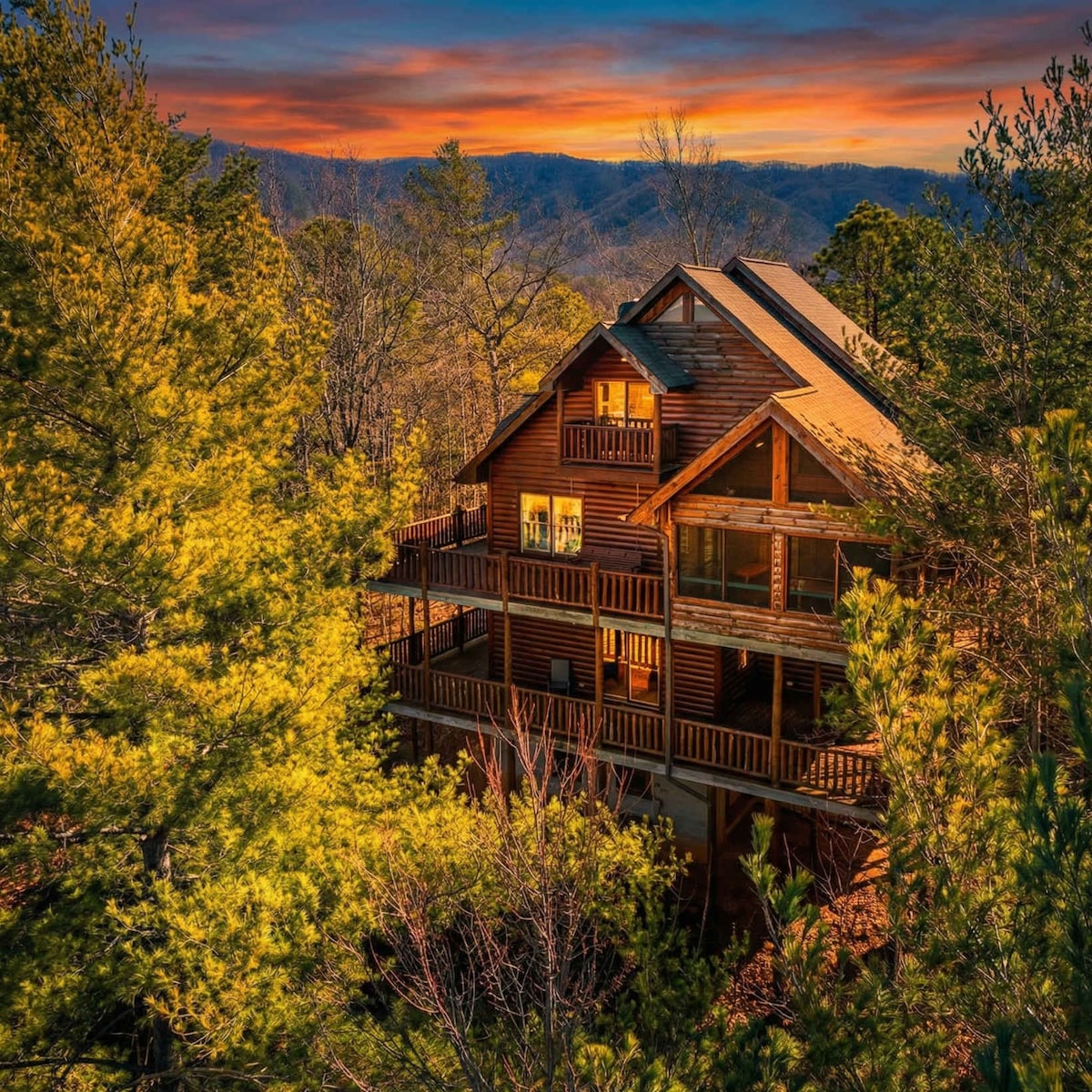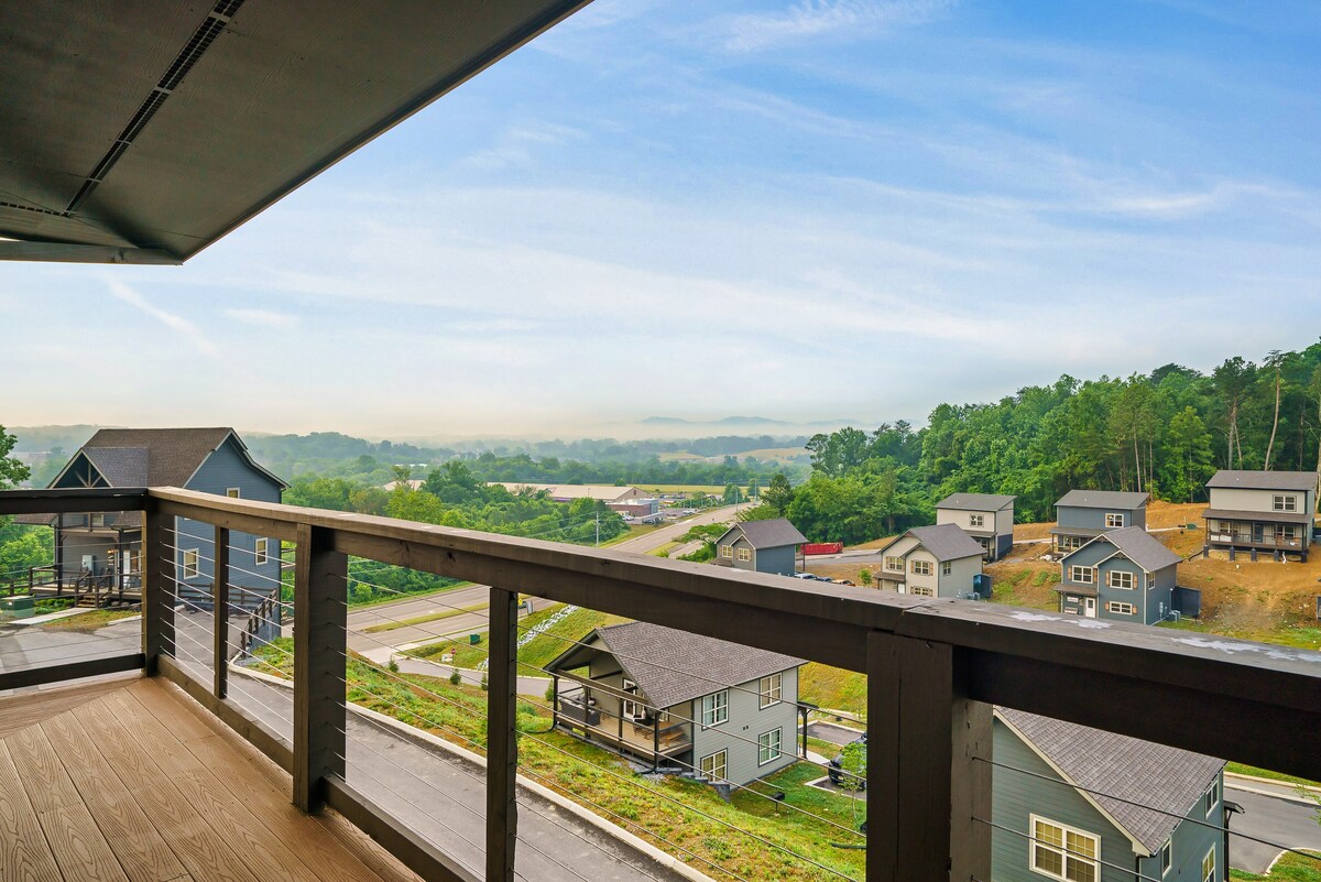 Nestled between Knoxville and the Smokies, this modern A-Frame is a dream getaway! Relax in the soaring living room with a massive stone fireplace, or challenge friends in the game room featuring ping pong and boss toss. The fully stocked chef’s kitchen is perfect for home-cooked meals, and the private hot tub is waiting for you after a long day of adventures. Enjoy your morning coffee on the balcony with forest views, then explore Pigeon Forge!