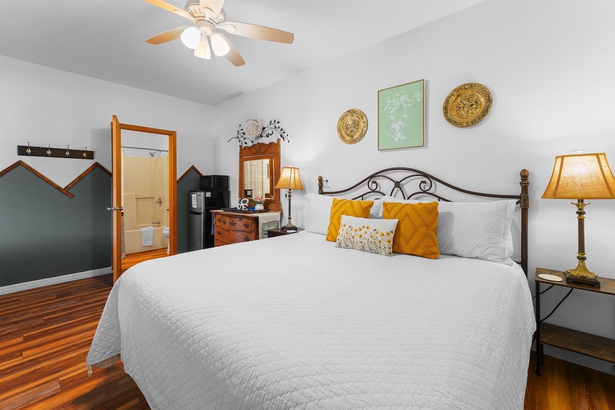 Escape to the Smoky Mountains in style! Lady Slipper offers a cozy, inviting retreat with stunning mountain views right from the room—perfect for morning coffee or enjoying the scenery. Relax in a warm, charming space with natural wood finishes, a king-size bed, and an ensuite bathroom with a shower/tub combo. The room also includes a small loveseat sitting area, mini fridge, microwave, K-cup coffee maker, and a Smart TV with streaming access. Step outside and enjoy the peaceful mountain surroundings. Hiking, wildlife, and adventure await just minutes from your doorstep, along with easy access to the attractions of Sevierville, Pigeon Forge, and Gatlinburg. Lady Slipper is perfect for couples or solo travelers looking to recharge in nature without sacrificing comfort.