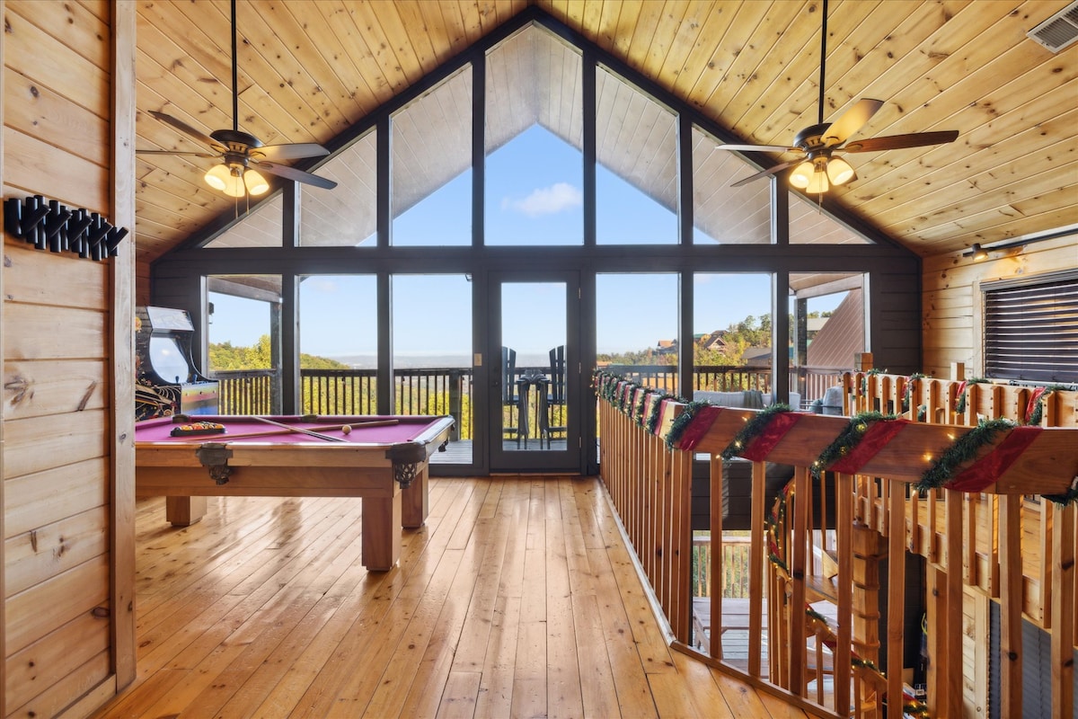 See why this cabin is Top 5% on Airbnb! Gorgeous, 1 mile to parkway and the Island! 2 spacious King Master Suites for a restful night. 2 full private bathrooms, sleeper sofa, sauna, hot tub, game room and fire pit! LOTS of amenities. You will love this open 1 level, 3 sets of French doors to the private balcony. Relax on the front porch with valley views or enjoy the hot tub in the large backyard space. The living space has high ceilings and a cozy fireplace for a retreat.