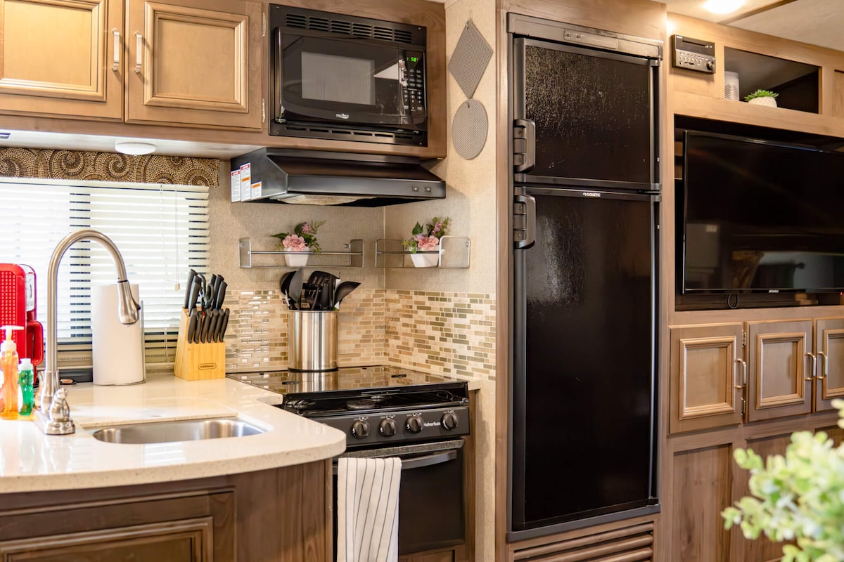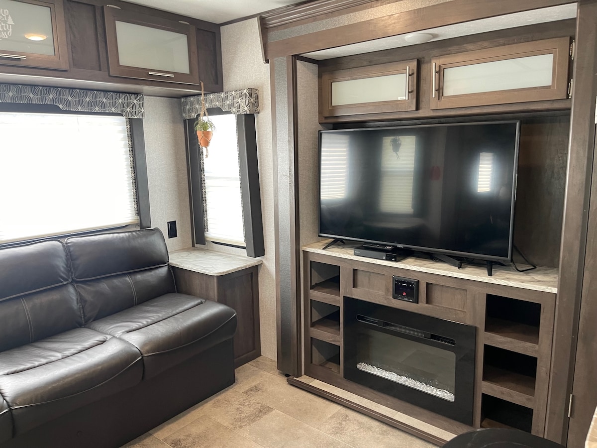 Minutes to Downtown Gatlinburg, this brand new RV camper is the perfect way to explore the great outdoors in style and comfort. With top-of-the-line amenities, this camper will make your next camping trip one to remember. The interior features a spacious living area with comfortable seating and a fully-equipped kitchen, complete with a refrigerator, stove, and microwave. The bedroom has a King-size mattress with 3 twin lofts upstairs and a pullout queen couch. See you around the campfire!