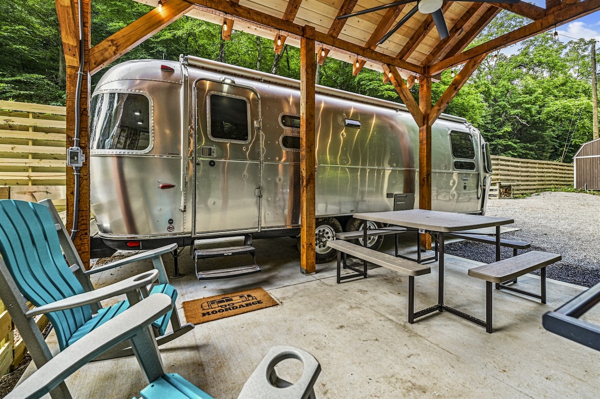 Make some memories at the Hideaway - a private, secluded pavilion with an Airstream, hot tub, outdoor TV, gas grill, and propane fire pit. The 22ft Airstream features a queen size bed (with upgraded Southampton Ultra Plush mattress), a kitchen area, dining booth, and bathroom with shower. The Hideaway property is located in the woods off of Chapman Hwy, at the end of a 0.25 mile driveway (2 miles from downtown Sevierville).