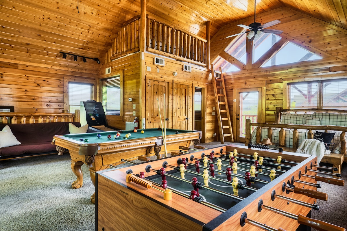 Welcome to the Rockstar Retreat, a music-themed cabin designed for an unforgettable getaway! This spacious 2184 sq. ft. cabin has three levels packed with entertainment and relaxation. Enjoy a private sauna, hot tub, pool table, foosball, and a PacMan multicade. Music lovers will find a Victrola music player with albums, CDs, and cassettes. The fully stocked kitchen and a charcoal grill awaits outside. Located just miles from Dollywood and Gatlinburg, it's the ultimate Smokies retreat!