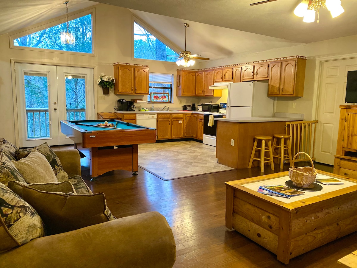 Cozy Bear Cabin is 25 minutes from Pigeon Forge, Dollywood, and Gatlinburg, and an hour from Smoky Mountain National Park. Just off the road, Cozy Bear is accessible by car with room for up to two larger vehicles. Our cabin is not fancy, but it’s bright, open, and quiet. It’s a little older but provides a clean and comfortable getaway for couples and families. Enjoy the back deck, a hot tub, two bedrooms, two full bathrooms, a sleeper sofa, pool table, and close shops and a neighborhood pool.