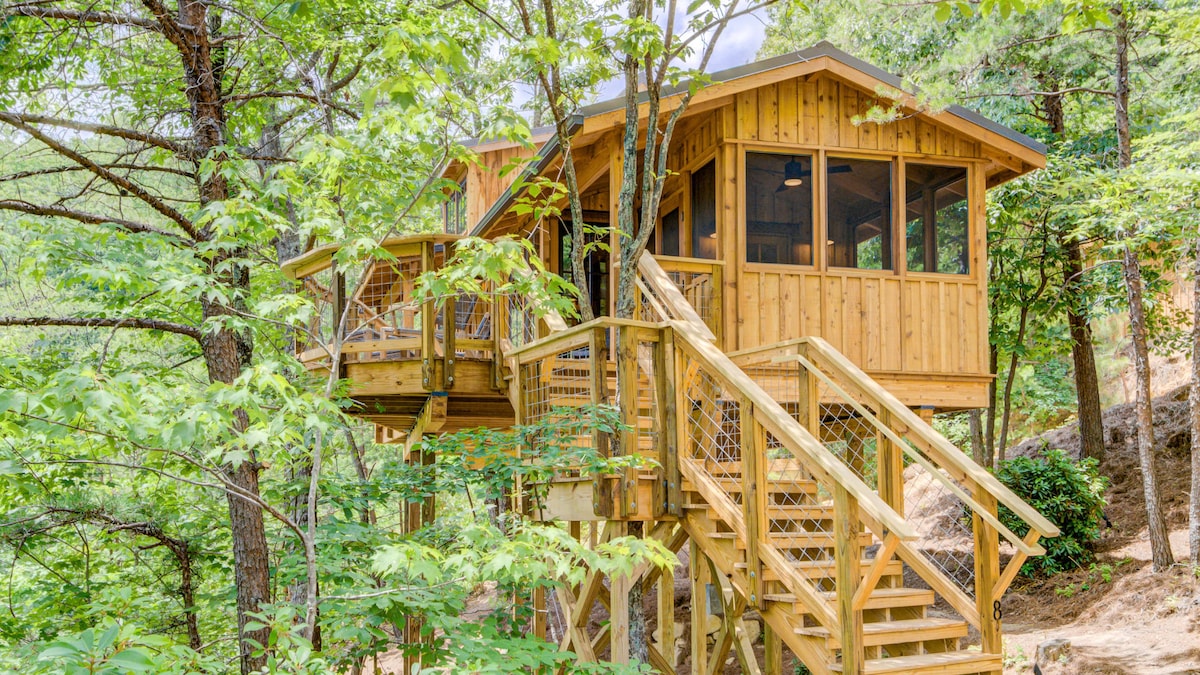 Step out of the hustle and bustle of everyday life by staying in this sweet little rustic treehouse near the Great Smoky Mountains. This semi-off grid cabin features a beautiful view and plenty of opportunity to enjoy nature with a bit of a "glamping feel." This cabin offers free parking, a short, lit hike to the cabin, a fire pit and picnic area, electricity (including a heat/AC), an outhouse, outdoor shower, and beautiful porch for enjoying the view. Water is available via a water cooler.