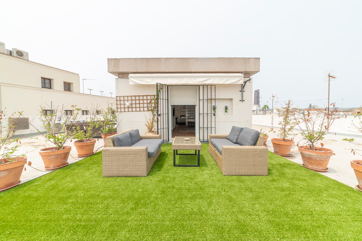 Suit- Loft con terraza privada en planta baja. Además podràs disfrutar de una terraza Chill Out en área común del edificio en tercera planta, abierta durante todo el año.. El alojamiento, dispone de Fibra óptica de 600 MB ( gratis), por lo que te permitirà teletrabajar al aire libre. Dispone de cama matrimonio y sofás cama 140x200. Ideal para parejas con o sin niños. Dispone de todas las comodidades para sentirse como en casa.