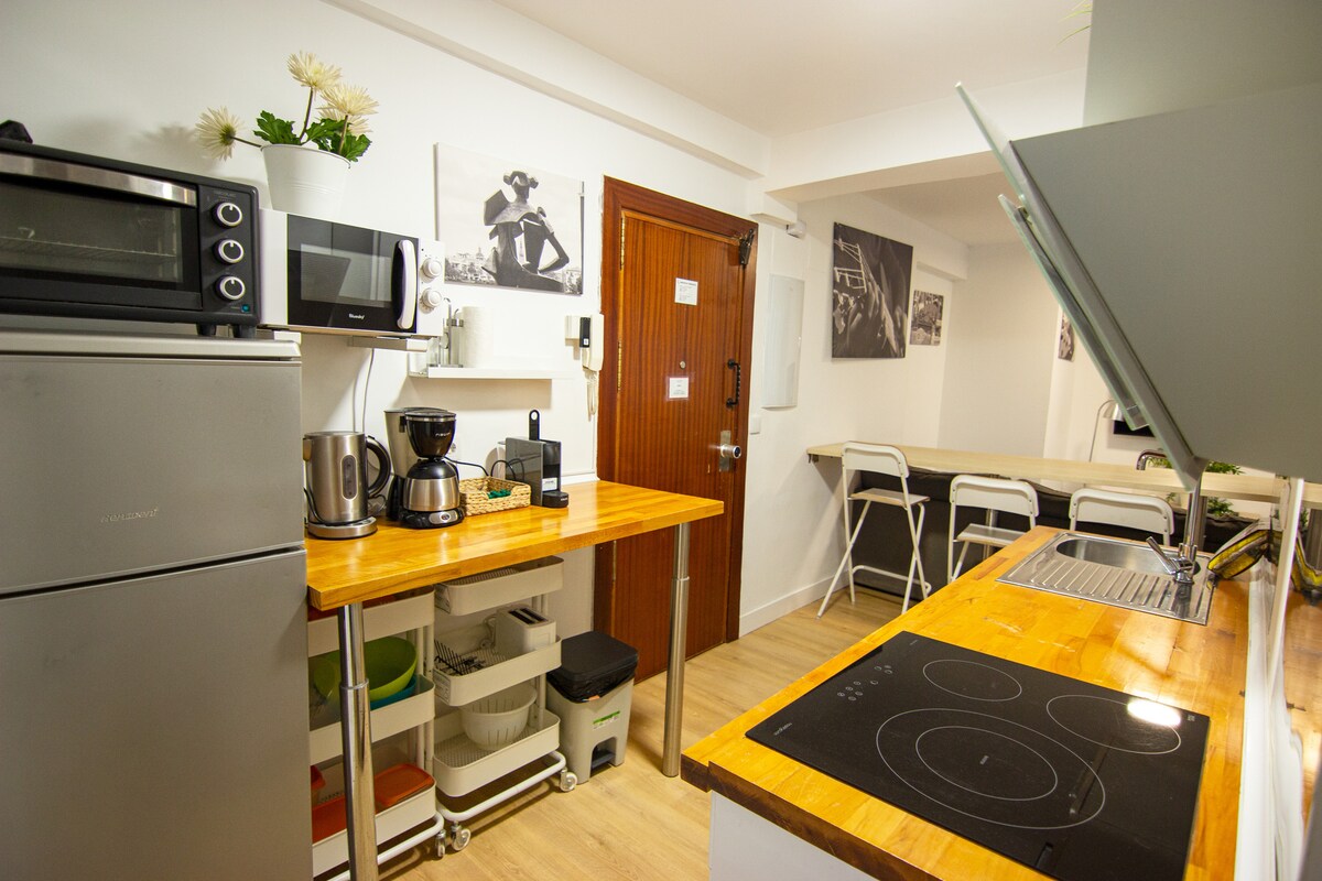 The Eva Recommends Soho Alameda apartments offer free Wi-Fi and hot/cold air conditioning, TV, kitchen with ceramic hob, microwave, capsule coffee maker, toaster, kettle, hairdryer, iron, bed linen and towels, and complete kitchenware. kitchen. Modern apartment with 1 bedroom, a bathroom with shower and a living room with an integrated kitchen. It is in a completely renovated house with 6 apartments and a small elevator.
