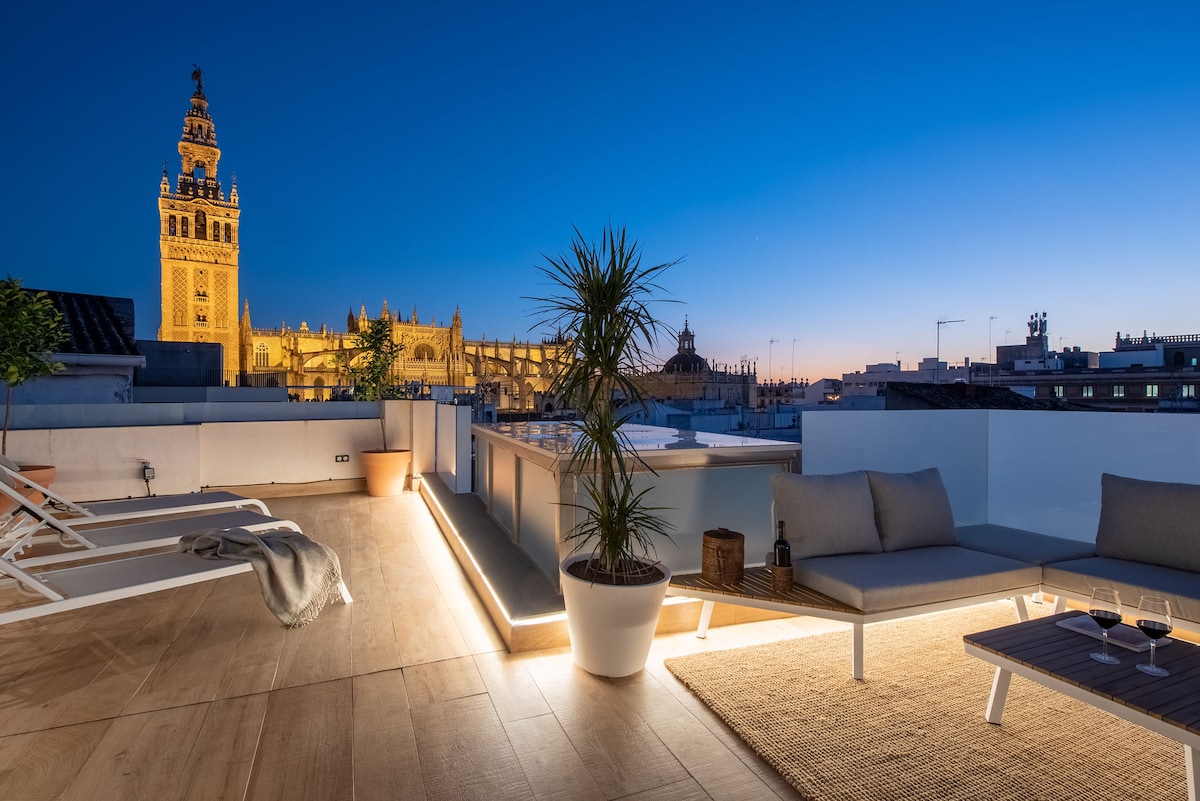 Magnificent penthouse in a recently built building with the highest quality finishes, with two private terraces with privileged views of the Cathedral. Located in the heart of Seville, just a few meters from the Cathedral, Giralda, and the rest of the city's monuments. The apartment is a very spacious studio with a queen-size bed, a living-dining room, a terrace with an outdoor dining area, and another terrace with a sofa, shower, and sun loungers. The views are unbeatable.