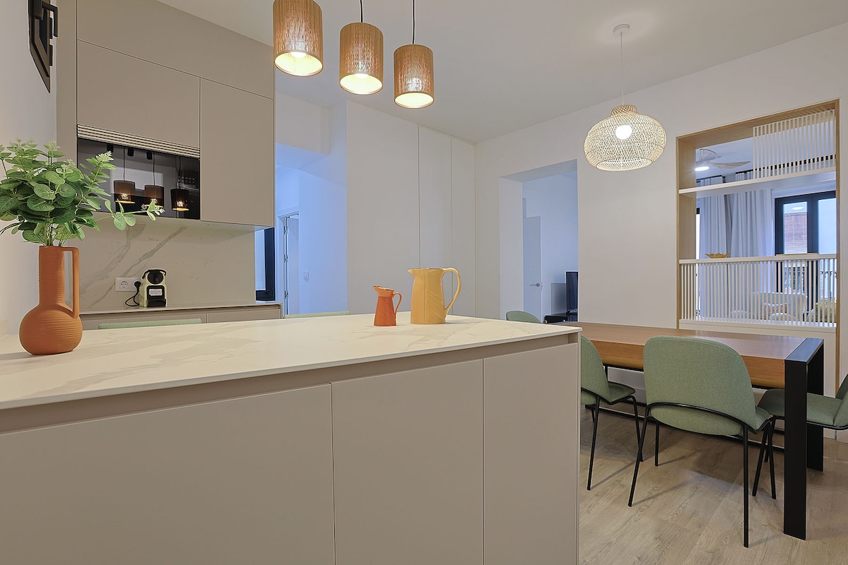 Beautifully restored townhouse converted into a modern vacation rental celebrates the old building structure with warm modern interiors and a touch of industrial style. Floor-to-ceiling, French windows look out over traditional balconies on to the charming street below. Sunlight floods the open plan space, casting light on exposed sandstone walls and illuminating the stunning oak beam ceilings. The shared top floor terrace offers incredible views to the Cathedral roof and the Giralda.