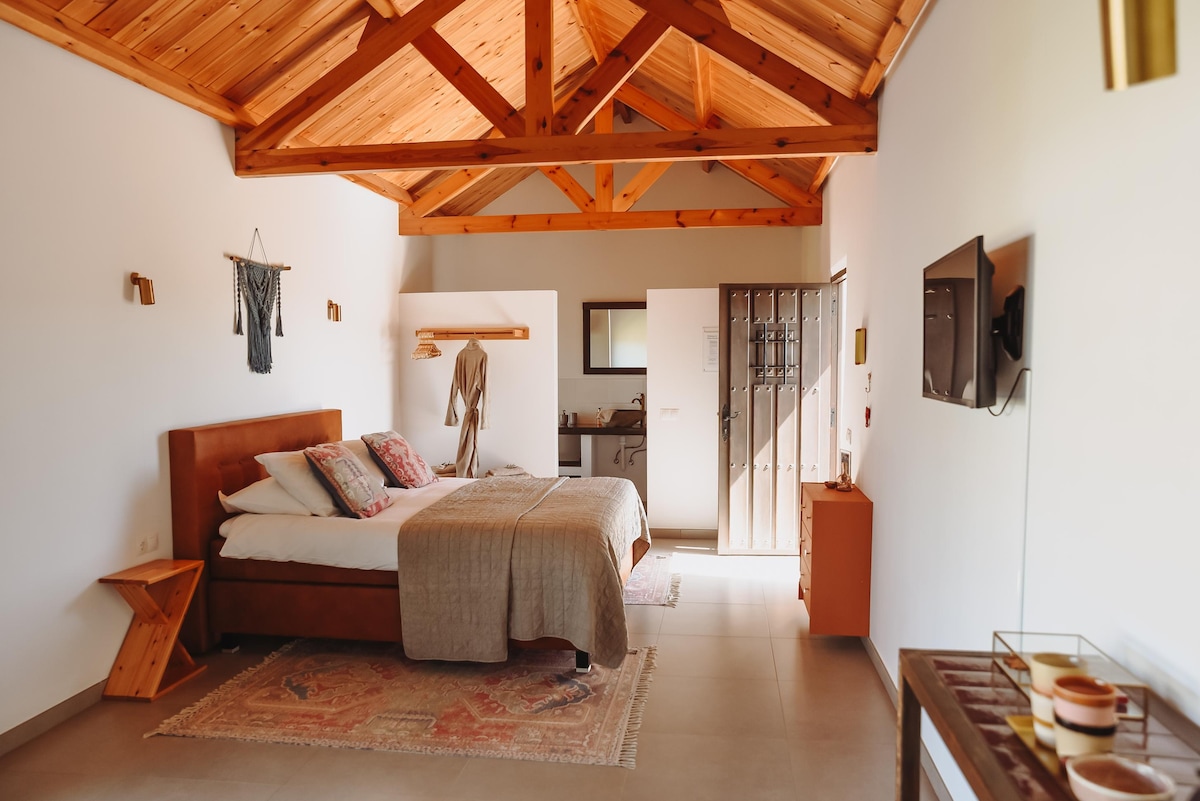A este alojamiento tan encantador y exclusivo no le falta detalle. Disfruta de tu gran habitación con baño privado y de las zonas comunes de la casa, su gran patio y porche, la cocina completa, el comedor y el salón con chimenea, que son compartidas por los huéspedes.