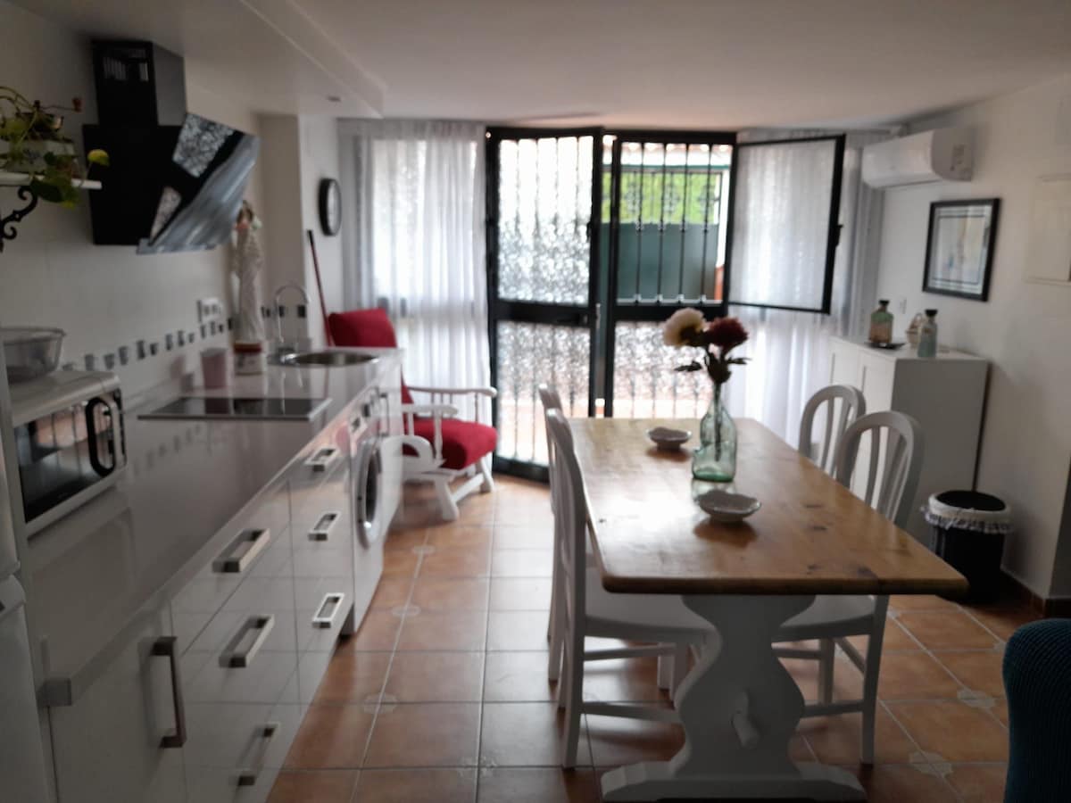 Nuevo apartamento en planta baja de mi casa, con puerta independiente. dormitorio con cama doble, salon amplio con sofa cama doble, y sofa cama 120, baño completo, zona de offi para comidas rápidas y desayunos, placa induccion, microondas, tv. Club social con piscina y bar, desde finales de mayo hasta septiembre. A 6 mnts del centro de sevilla en auto, con buena comunicación de bus y metro.