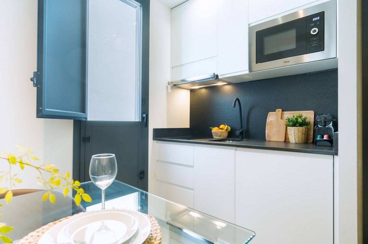 Maravilloso apartamento en edificio completamente rehabilitado en 2023 con materiales de altísima calidad tratados artesanalmente. Cuenta con 2 dormitorios, 2 baños, salón, comedor y cocina integrada completamente equipada (horno, microondas, cafetera Nespresso Vertuo, etc... Sistema de aire acondicionado y calefacción centralizado. En Planta Ático cuenta con Piscina y Solárium con vistas panorámicas a la Ciudad. PARKING CERCANO GRATUITO BAJO DEMANDA
