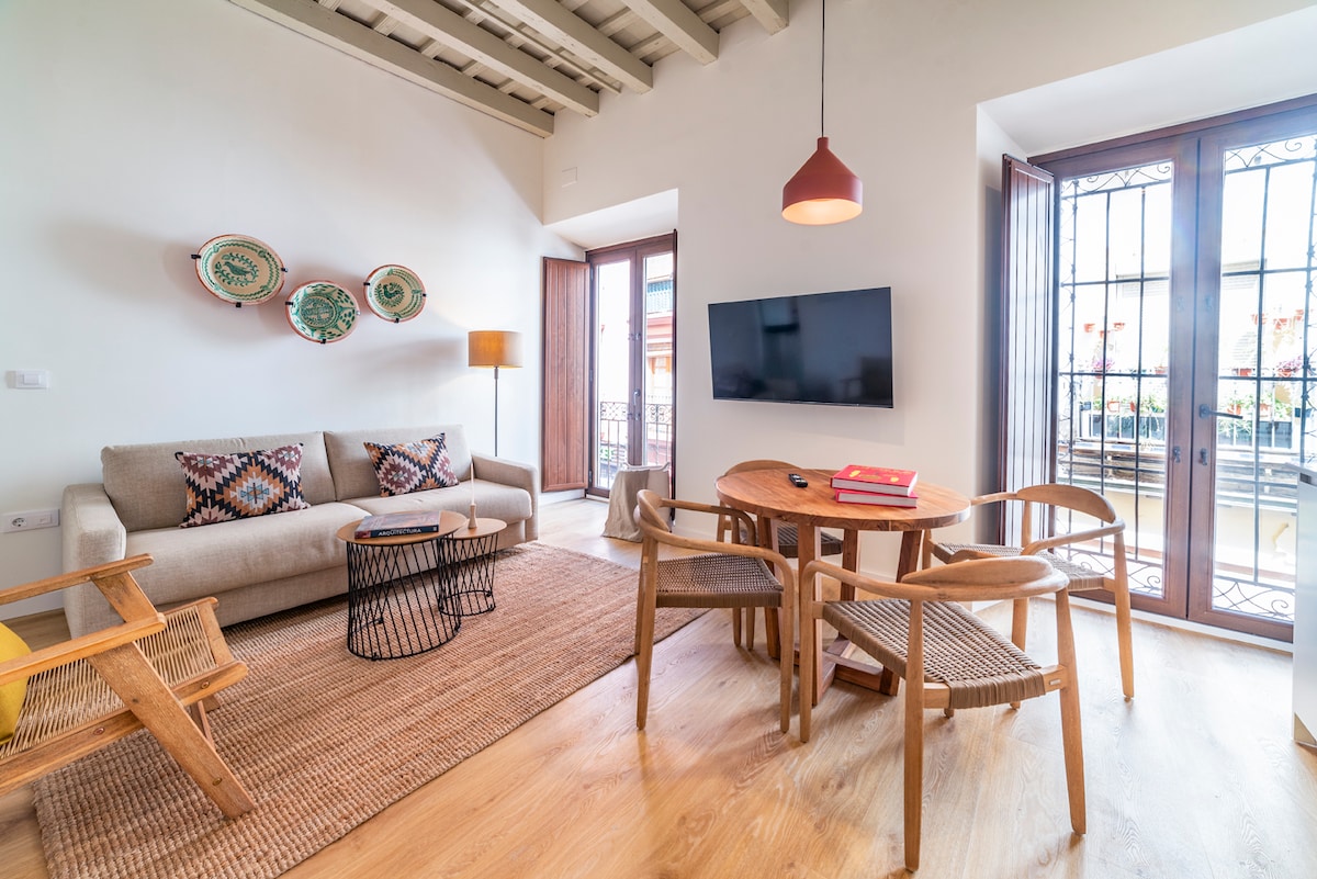 Balcón para Semana Santa!Acogedor y muy luminoso apartamento en Casa-Palacio. El espacio es totalmente exterior y con una preciosa luz y ventilación natural en todas sus estancias. Redecorado con muebles confortables en tonos neutros y cálidos. Suelo de mármol como el edificio, da al conjunto una sensación de paz y descanso para el huésped. Disfruta de 3 amplios balcones a la calle con vistas a La Casa de la Moneda y al Postigo, con rejas y persianas, que garantizan su seguridad e intimidad.
