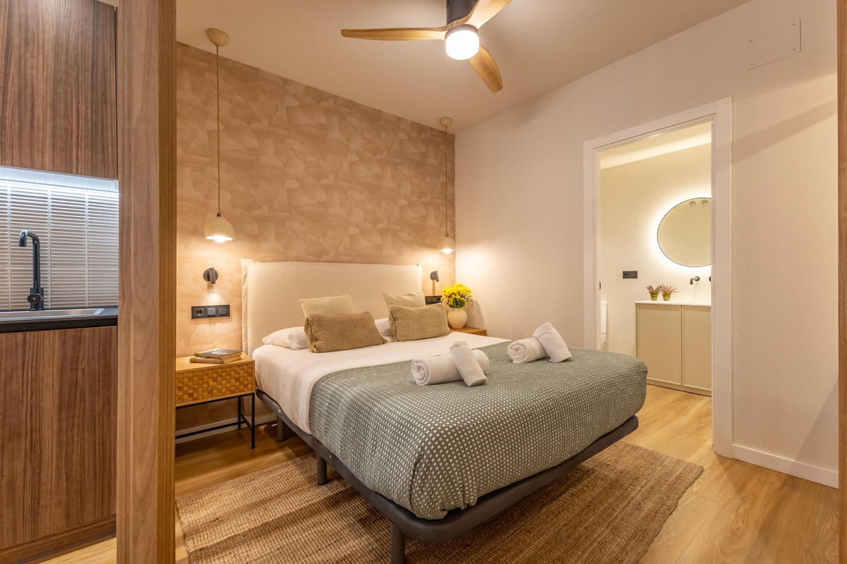 Magnificent apartment studio style, in a recently built building with the highest quality, designer furniture and access to a spectacular common terrace with privileged views of the Cathedral. Located in the heart of Seville, just a few meters from the Cathedral and Giralda, City Hall and the rest of the city's monuments. The fully equipped apartment with 2 balconies consists of 1 space with a queen size bed, living-dining room, kitchen and a beautiful high-level bathroom.