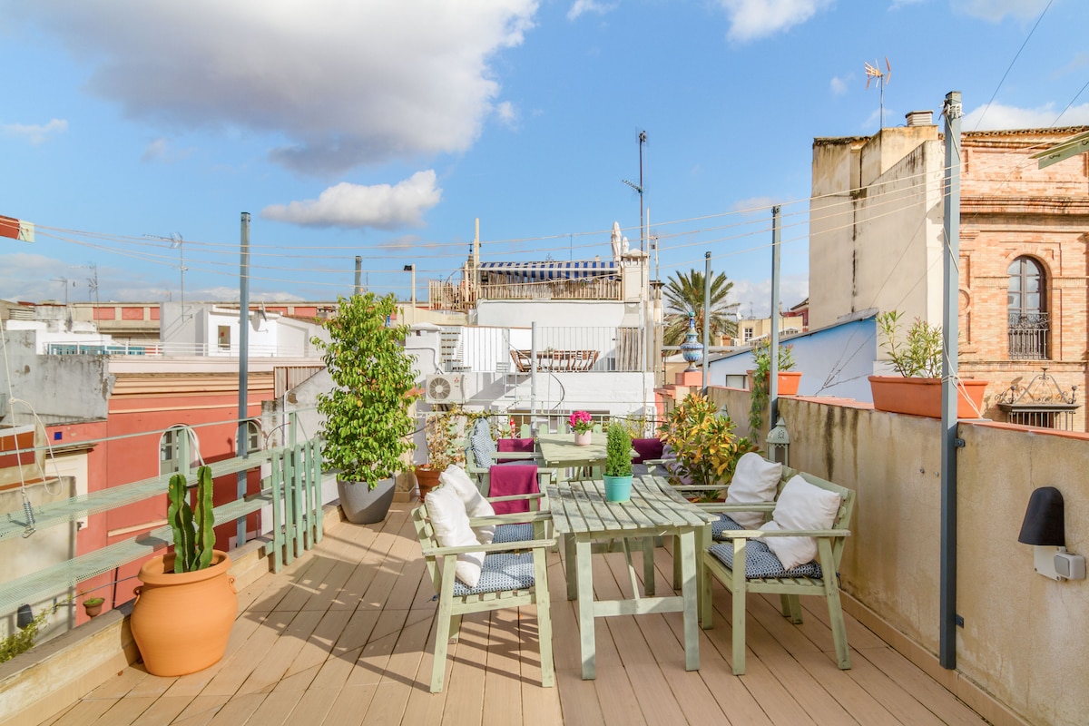Spectacular and cozy apartment in the Plaza de la Magdalena, the heart of Seville. Its spectacular terrace is a privilege, as you will be able to enjoy the sun of Seville at any time of the year. Its location is simply unbeatable: 10 minutes from the Giralda, the Cathedral or the famous Setas de Sevilla and a few meters from the river and the Puente de Triana. In addition, in the surroundings you can enjoy countless bars and local restaurants to get to know the local cuisine in the best way.
