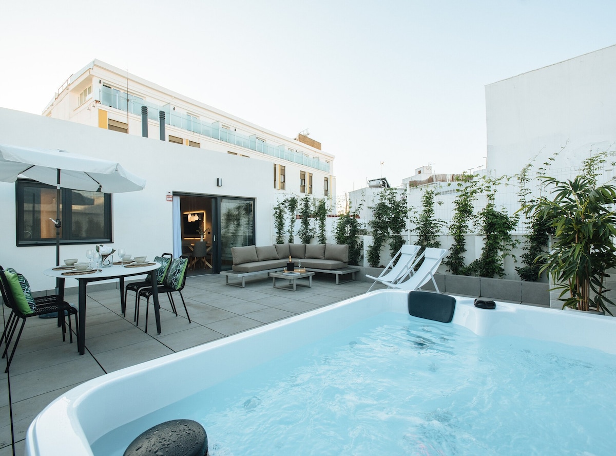 Exclusive 3-bedroom duplex in the heart of Seville, each room with a private bathroom and TV. The master bedroom includes a private terrace for peaceful moments. The crown jewel is the outdoor terrace with a private jacuzzi and dining area, perfect for enjoying the Sevillian sky
