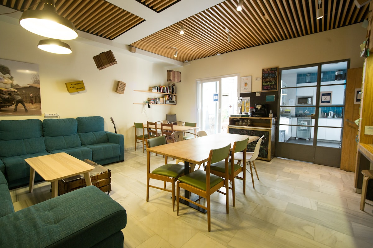 Albergue situado en el corazón de Sevilla. Creado por y para viajeros que quieran disfrutar de una experiencia única. Tendrás acceso a cocina, terraza y comedor. Lugares donde relajarse y compartir experiencias con otros huéspedes. Disponemos de varios baños en la misma planta de la habitación, servicio de lavandería, taquillas, aire acondicionado, wifi de alta velocidad, información y venta de actividades turísticas, entre otros muchos. ¡No dudes en preguntarnos para más información!