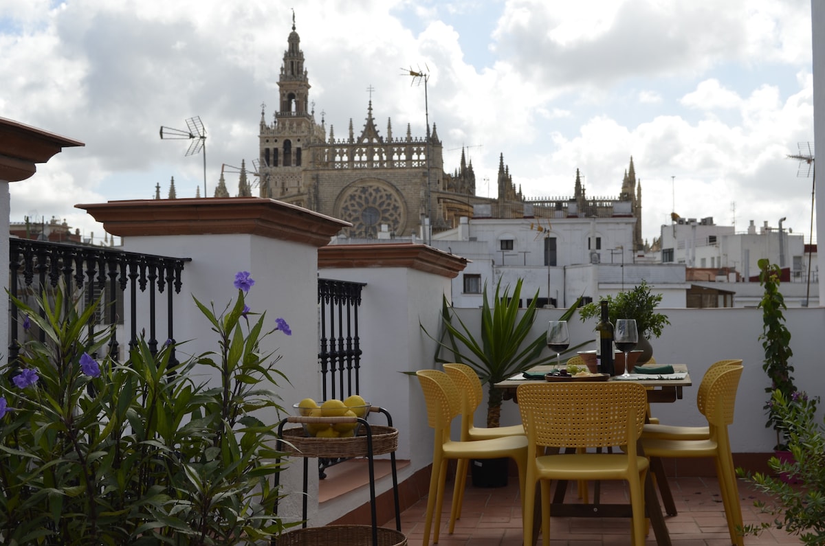 Fabulous terrace of exclusive use with zone solarium with shower of exterior, dining room of exterior and zone of being with dress direct to the Giralda, Cathedral.Amazing views. I give my guests independence, but I am available if they need me. The penthouse is located on Av de la Constitución. It's in an elegant area of the historic center of Seville, surrounded by restaurants and places of interest.