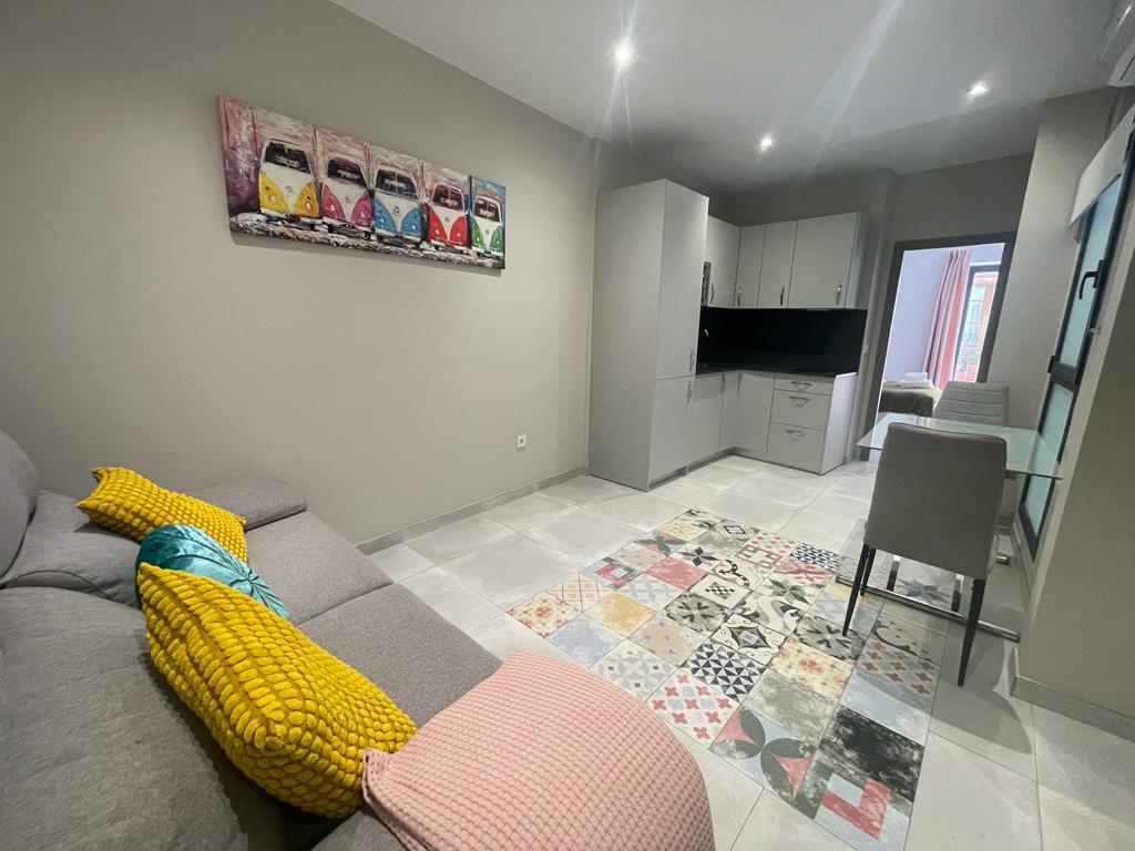 Moderno apartamento localizado en planta baja. Está distribuido en un amplio salón-comedor-cocina, tres usos en un mismo espacio, cómodo, versátil y funcional. Sofá cama doble en el salón y gran ventanal por el que entra mucha luz. El dormitorio cuenta con cama de matrimonio y salida al patio privado, donde puedes disfrutar de tus magníficos desayunos y veladas..