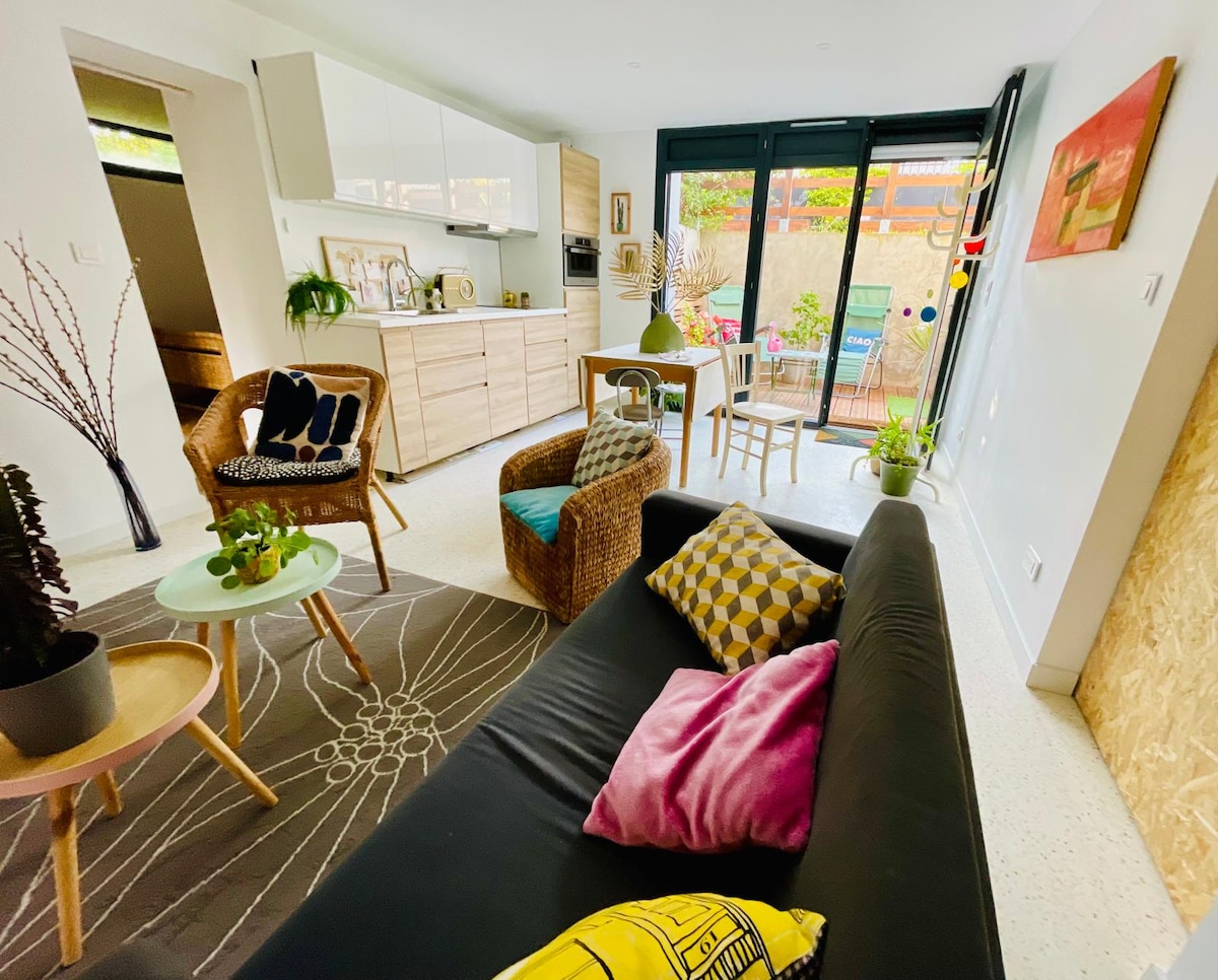 Magnifique studette cozy avec vue sur grand jardin. Le logement est très bien situé à 5min à pied de la gare, à 25min de Paris. Supermarchés, boulangeries et commerces à 3min à pied. Le logement est équipé d'un grand canapé-lit pour deux personnes, une salle de bain avec douche et toilettes, un bureau, des rangements, armoire. La wifi est comprise. un coin cuisine avec frigo congélateur un micro onde une table de travail avec deux chaises.