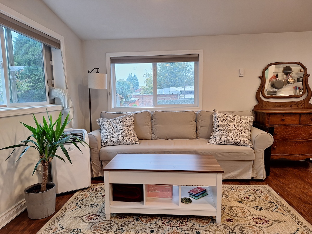 The cottage is a private, self-contained unit, featuring a well-stocked kitchenette, tiled shower, bedroom loft with french doors opening onto a deck, flat screen TV, DVD player, wifi, Bluetooth wireless speaker, and off street parking. Dog weight limit 25 pounds. Noise may be an issue for some due to airplanes. Stairs to the loft are steep. We are also located on a steep hill. We provide coffee/tea, juice, and some snacks. Everyone is welcome here.