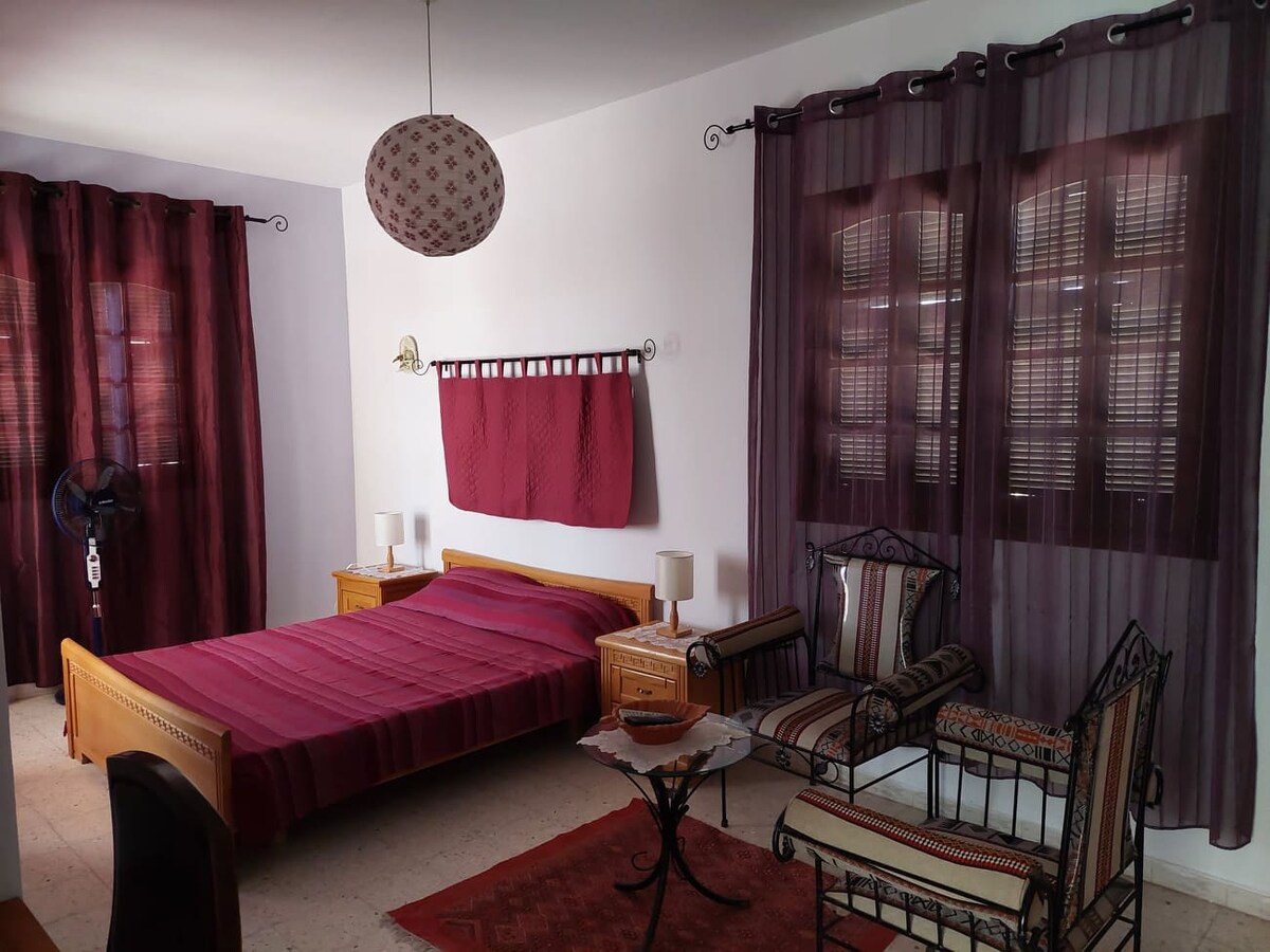 La ville de Chebba est une ville côtière à 40 km de Mahdia, 86 km de l'aéroport de Sfax et à 80 km de l' aéroport de Monastir. Restaurants à la carte, fast-food, cafétérias sont implantés tout au long de la côte. La nage, la plongée, le snorkeling et d'autres sports nautiques sont les principaux divertissements à pratiquer. Le studio avec terrasse, se situe au 2 ème étage de ma villa à environ 150 m de la plage. Il est accessible à travers son entrée indépendante renfermant un parking.