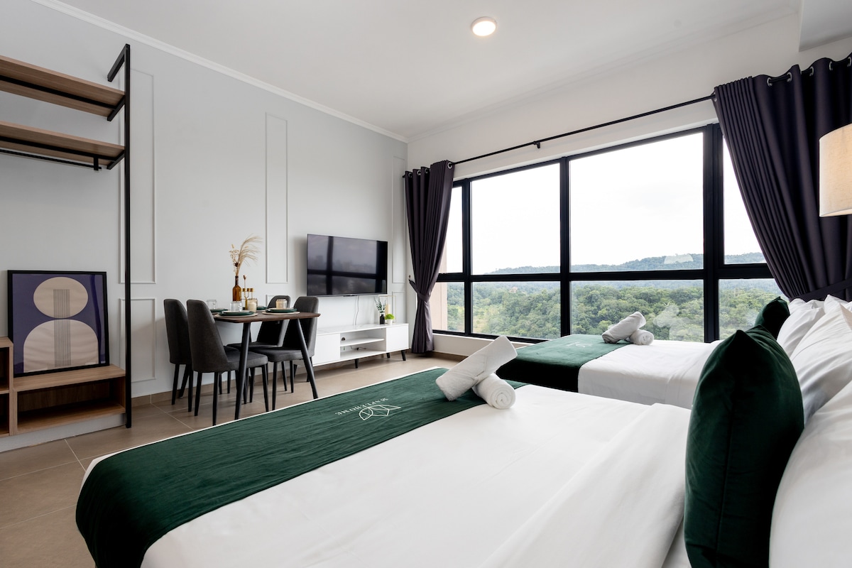 Have fun with the whole family as this place gives direct walking access via “sunway canopy walk” to Sunway Lagoon Theme Park, Sunway Pyramid mall, Sunway Medical Hospital and Sunway Uni. The place has natural dark wood floors, equipped with a UHD flat screen TV and Netflix channel. You will be blown away with the Sunway Resort view that is definitely an instaworthy, lending itself to being photographed and posted on your social media!