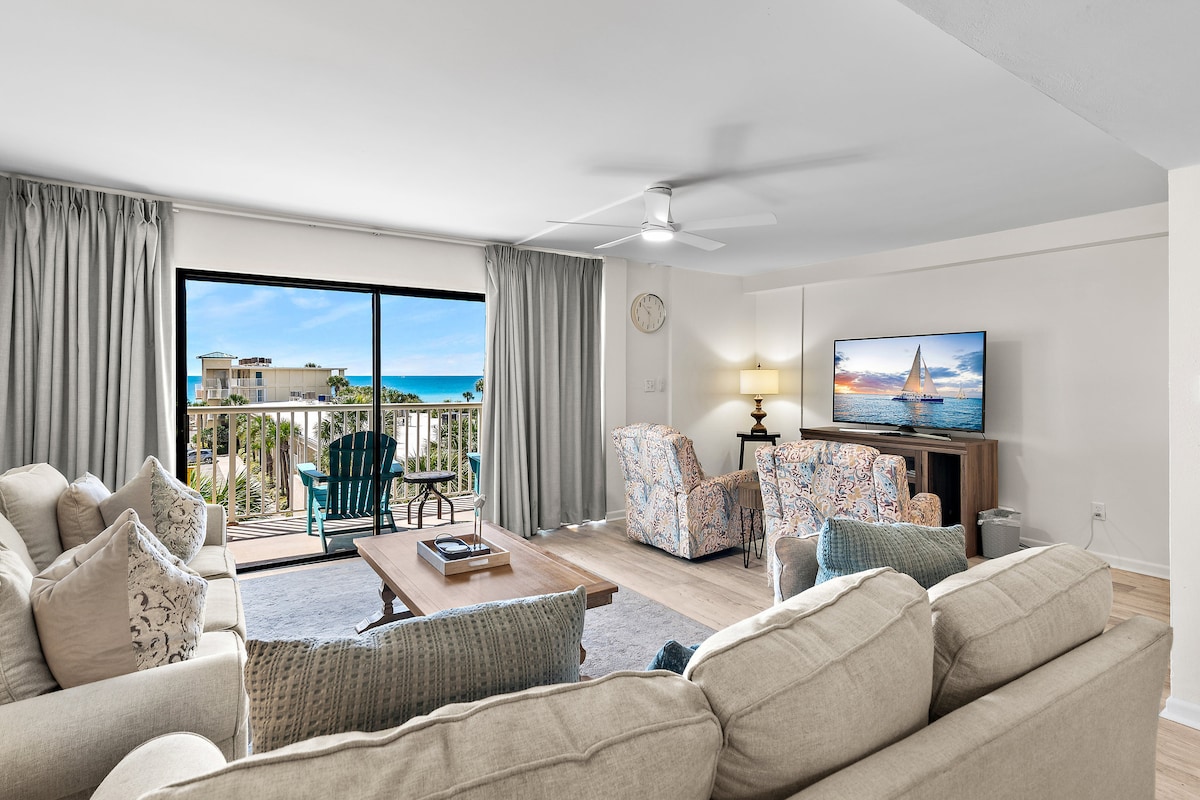 5 star rated, classy 2-bedroom condo on Scenic Highway 98 in Destin with private beach access. This family-friendly area features a bike path, nearby dining, and Destin beach just across the road. Enjoy updated amenities, a fully stocked kitchen, tennis courts, pickleball, a private heated pool (seasonal), and a secure boom gate entrance for private parking. The master bedroom has a king bed and en-suite bath, while the second bedroom offers a twin and full bed with a bathroom across the hall.