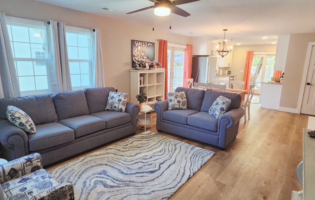 This centrally-located, dog-friendly, single-level home will have you creating perfect days in no time! Newly remodeled in 2022. Less than 2 miles to the beach, minutes away from restaurants, and several golf courses within reach! Inside you will find hardwood floors, an open living/kitchen area with plenty of room to gather, and a charming adjacent room that includes a table that seats six. TVs in every room with streaming, and Serta mattresses to ensure a blissful nights sleep!