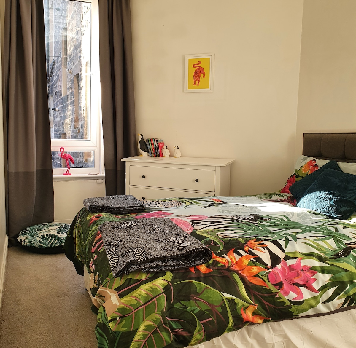 Comfortable and stylish home available in the city centre of Edinburgh. The flat boasts two large bedrooms, one with a luxurious super king bed and the other with a cosy king; newly installed art deco-inspired bathroom, with wide and deep freestanding bath; colourful and spacious living room, and a cute brightly-coloured kitchen with a new appliances. The flat is served well by bus routes, although Lothian Road and Princess Street are within walking distance.