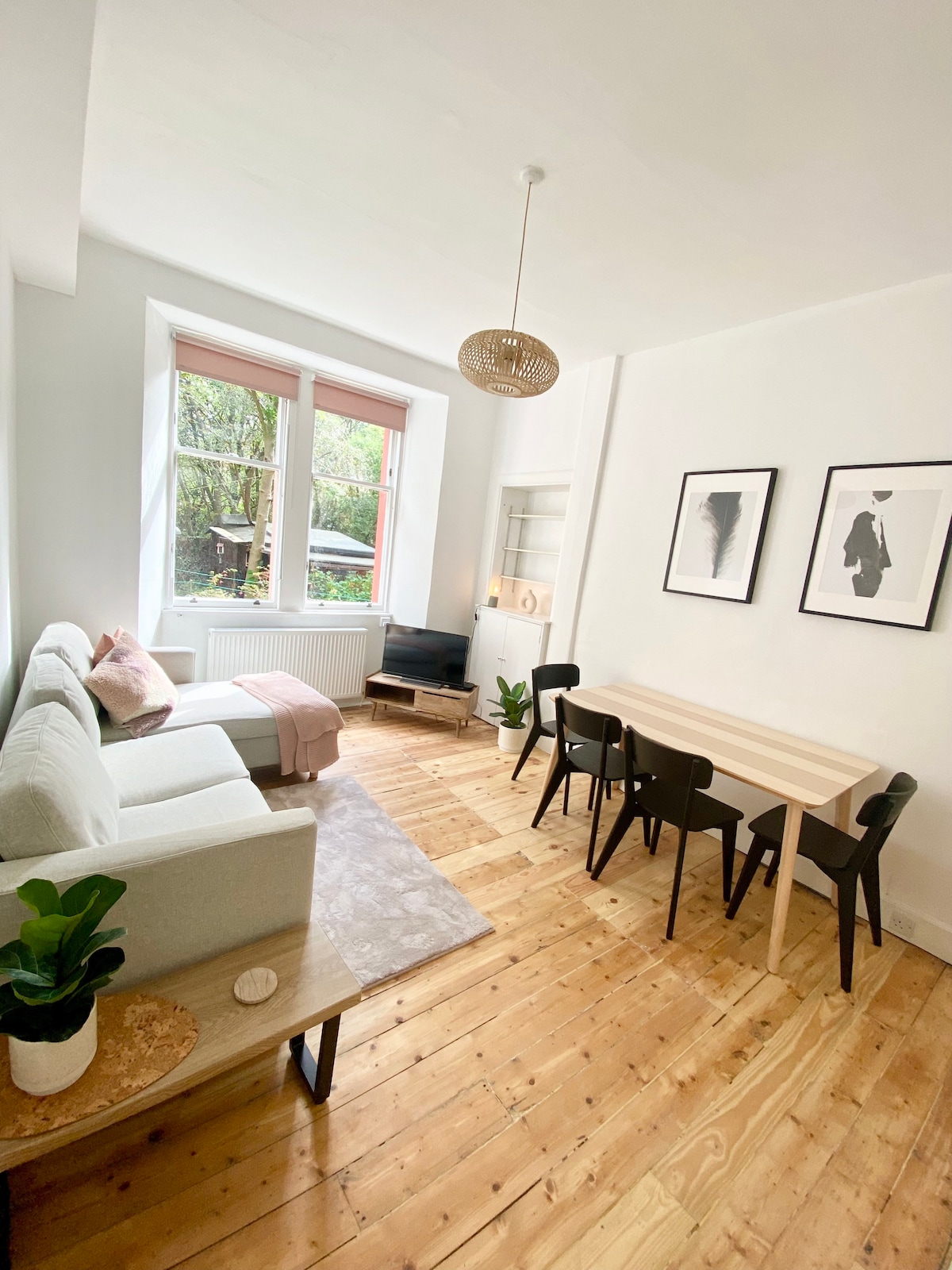 Enjoy a stylish experience at this centrally-located flat in Edinburgh. The place has just been refurbished and benefits from modern look and fancy design. The apartment is always cleaned to the highest standards. Enjoy your private entrance, peaceful bedroom at the back of the flat with a new king size bed, well equiped open kitchen. living room with sofa bed for an extra person, large 65 inch tv and playing music with alexa.
