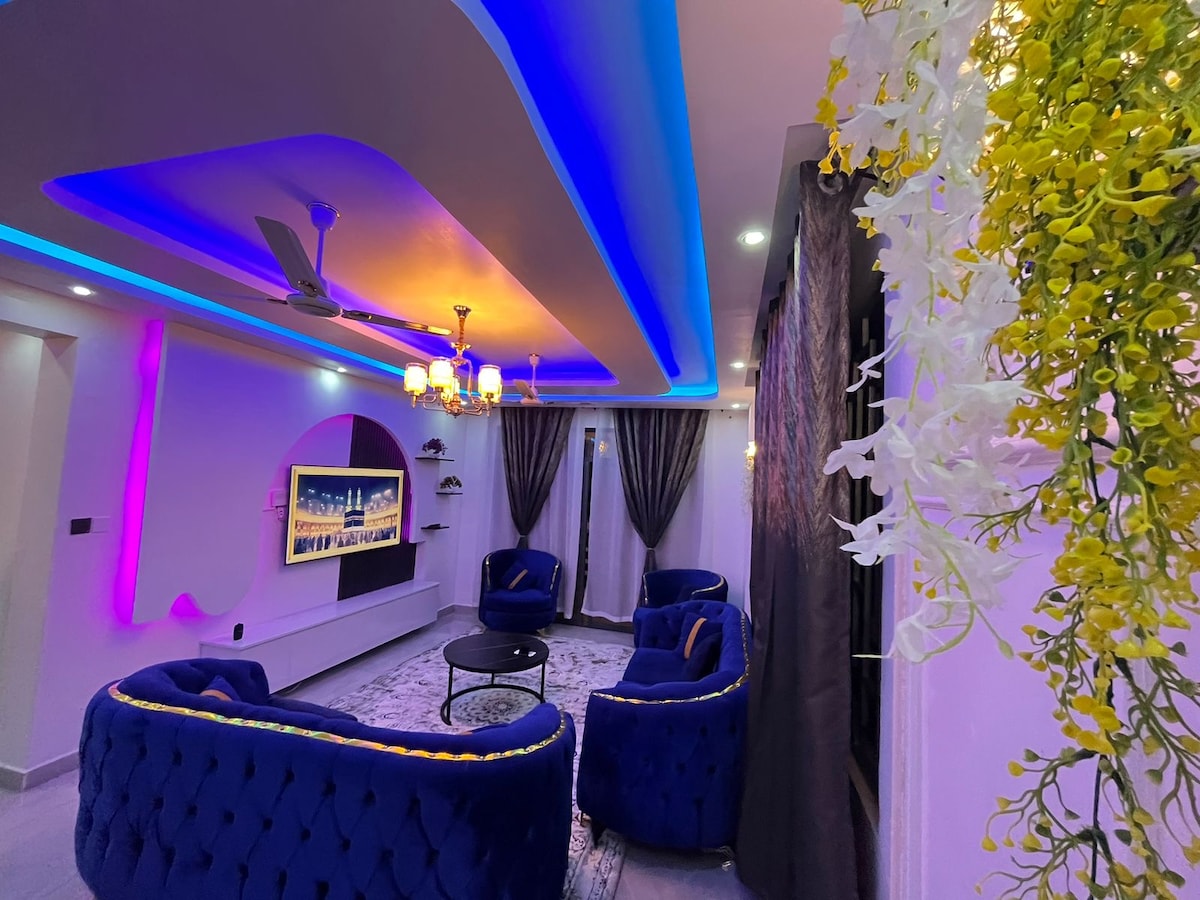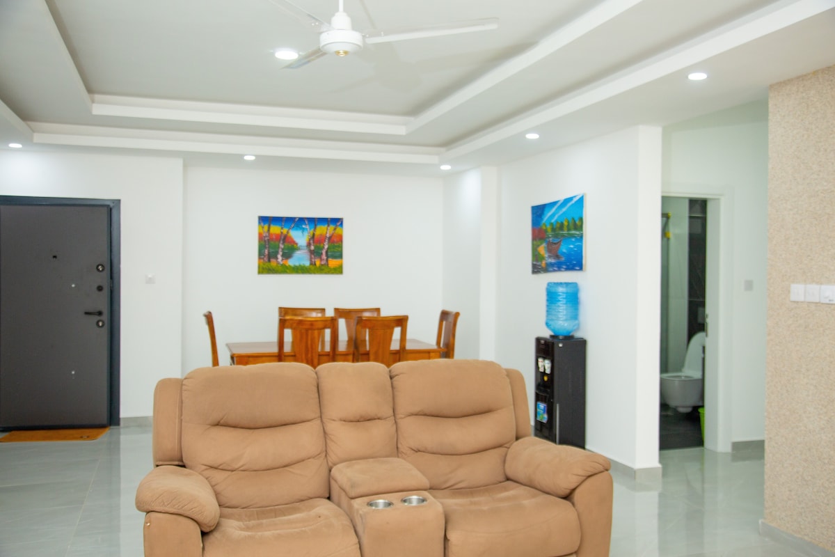 Relax in this fully furnished 3-bedroom apartment in Mombasa — perfect for families or groups. • Master Bedroom: King bed, private bathroom with shower, and private balcony • Room 2: One twin bed + one full bed • Room 3: Two twin beds • full shower Bathroom: Clean and full-size for guests • Living Room: Cozy LED lighting, smart TV, elegant blue sofas • Kitchen: Fully equipped with cooker, fridge, blender & more • Dining Area: Seats 6 comfortably • Free Wi-Fi + Reliable Power Fresh wate