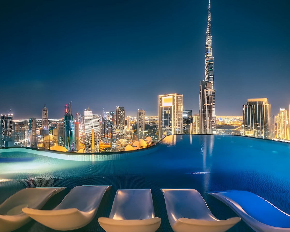 This apartment is exceptionally rare: a full, unobstructed Burj Khalifa view from both the bedroom and living room, two 75-inch Smart TVs, a dedicated workspace facing the skyline, custom-made luxury interiors, a balcony for the fountain & light show and NYE fireworks, direct Dubai Mall access, and an infinity pool with Burj views. A truly unique, high-demand stay in Downtown Dubai.