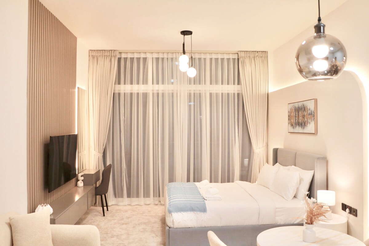 Voyage d'affaires ou tourisme ? Séjournez dans un studio neuf avec terrasse privative parmi les immeubles de luxe de Dubaï. Le logement donne accès à : - Une piscine avec cinéma - Une salle de sport - Espace barbecue - Espace détente avec une fontaine extérieure À proximité de : - Dubaï Miracle Garden et Dubaï Butterfly Garden (5 min en voiture) - Dubaï Hills Mall (10 min en voiture) - Plage de JBR et Kite Beach (22 min en voiture) - Toutes commodités (cafés, magasins, restaurants)