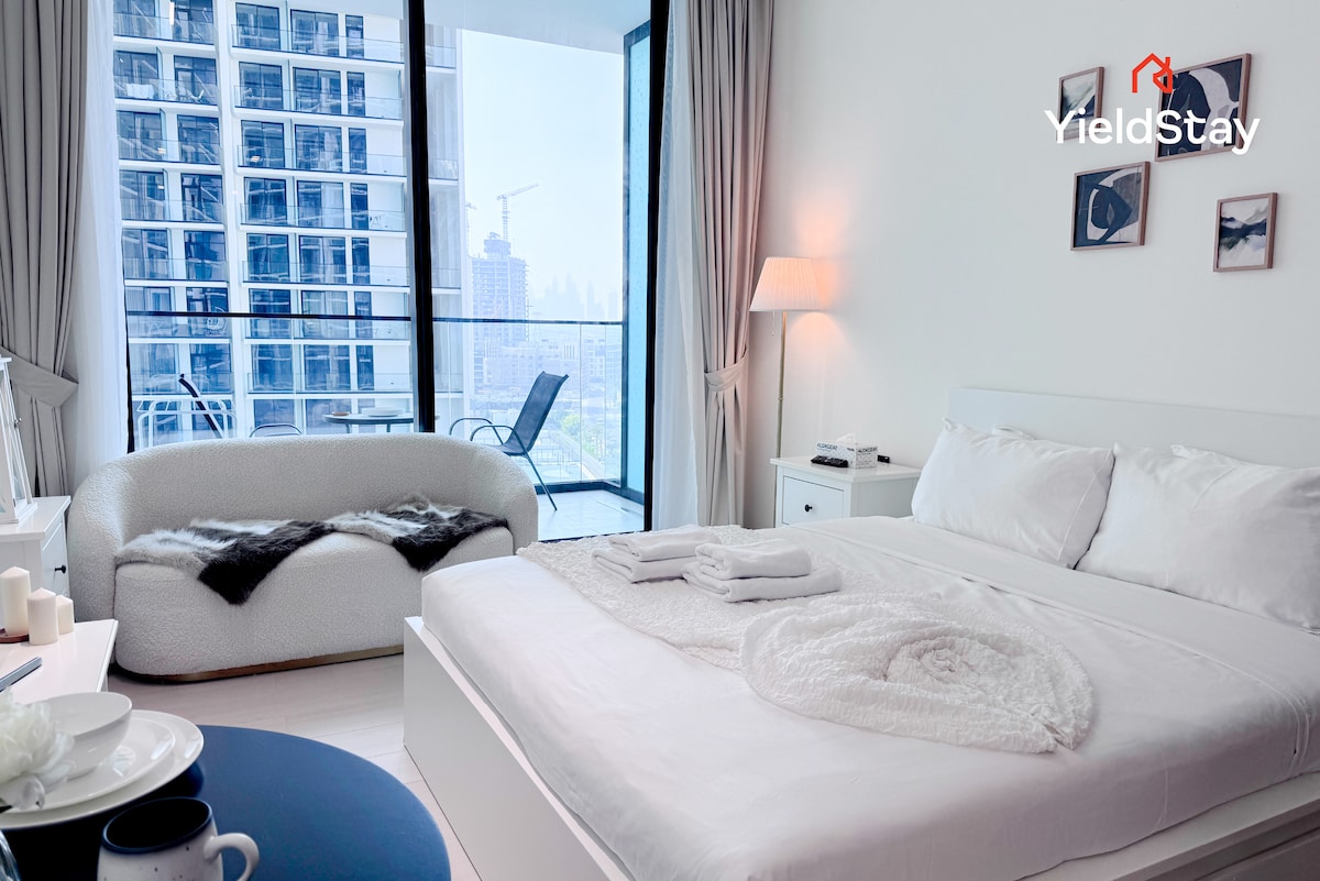 YieldStay: Stylish Studio w/ Balcony | Pool • Gym Modern studio in JVC, Dubai with a private balcony. Queen bed, smart TV, Wi-Fi, and kitchenette. Enjoy resort-style amenities: outdoor pool gym sauna 24/7 security, and on-site supermarket. Prime location near: Circle Mall Miracle Garden Global Village & Dubai Autodrome. Extras: Free parking. No pets/smoking indoor. Perfect for couples Solo travelers & business guests.