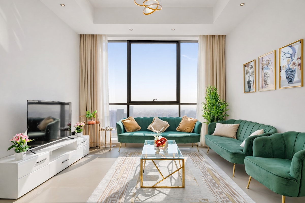 Experience luxury and comfort in this high-rise apartment featuring modern Arabic-inspired art, premium finishes, and panoramic views, ideal for travelers seeking an upscale city retreat. The space combines modern warmth with a bright living area, dining and workspaces, a fully equipped kitchen, and flexible sleeping options with luxury linens. Premium amenities include spa-like bathrooms, guest essentials, secure parking, and access to an elite building with high-speed elevators.