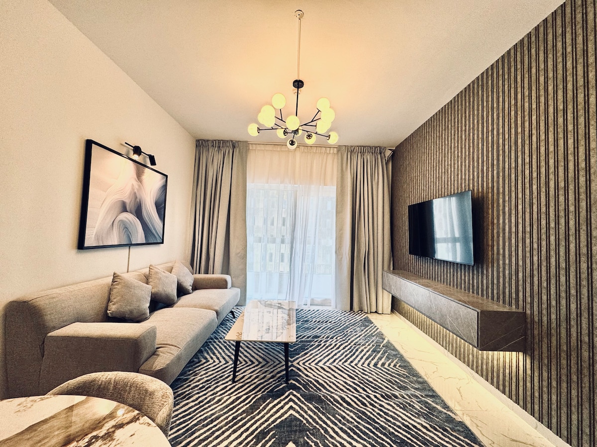 Welcome to Luxe Minimalist, a luxury studio apartment in Al Mamsha by Alef. - Separate Living Room with Sofa Cum bed - Brand new Apartment - Al Mamsha offers a variety of coffee shops, cafes, grocery stores, and play areas, making it a vibrant destination. - Kitchen with all utensils. - Free Private Parking. - The Apartment is on the 5th floor. - Pool Access - Enjoy quick access to Sharjah Airport (10 mins) and Dubai Airport (20 mins) - Free Wifi