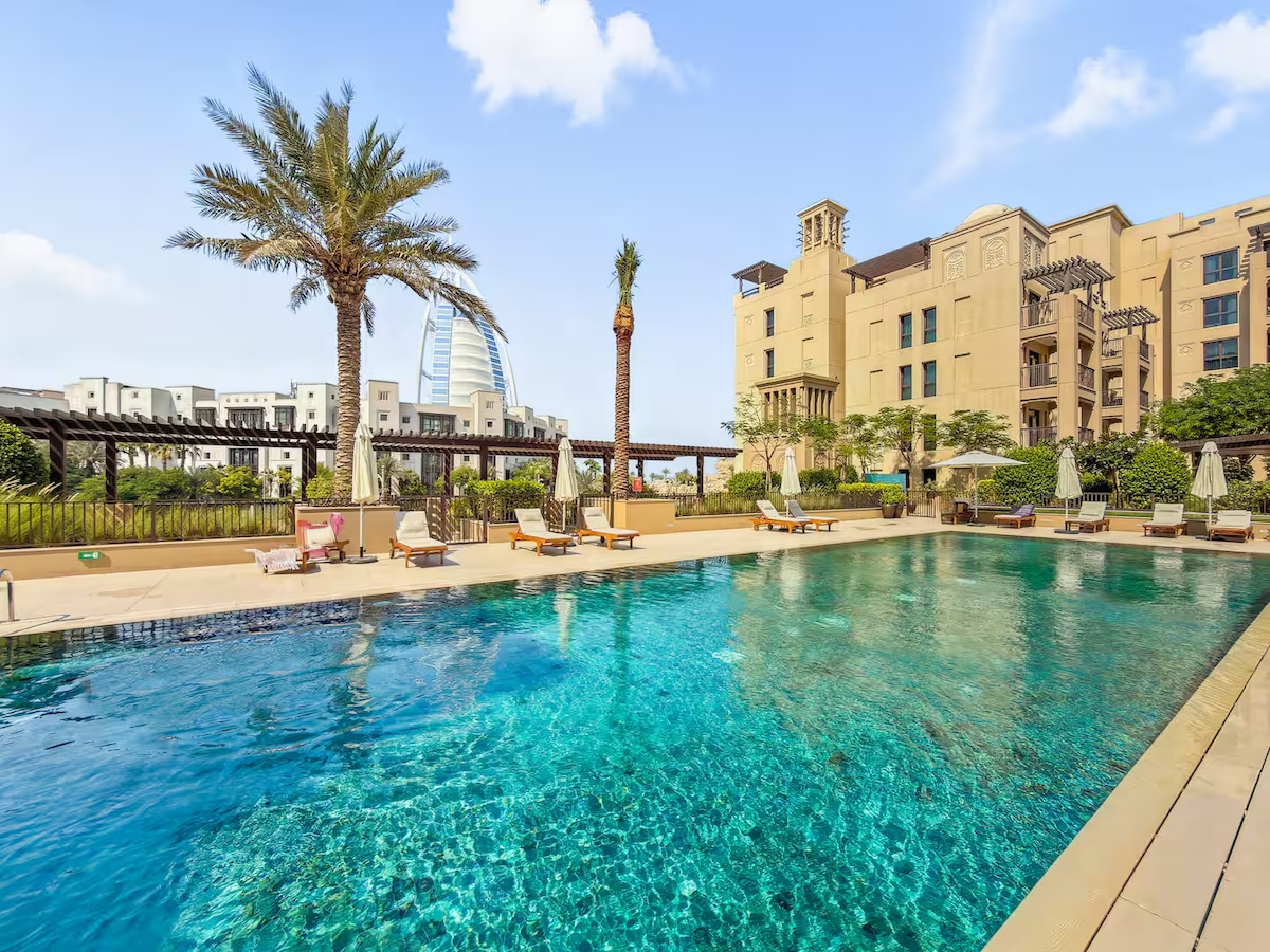 Luxury apartment with direct Burj Al Arab view, located in one of Dubai’s most prestigious complexes. Spacious and elegant interiors featuring a finely furnished living room with marble details and a dining area for six. The living area opens onto a balcony with a relaxing seating area and iconic views. Two king-size bedrooms, both with Burj Al Arab views, including a master bedroom with en-suite bathroom. Building amenities include a panoramic pool, gym, and private parking.