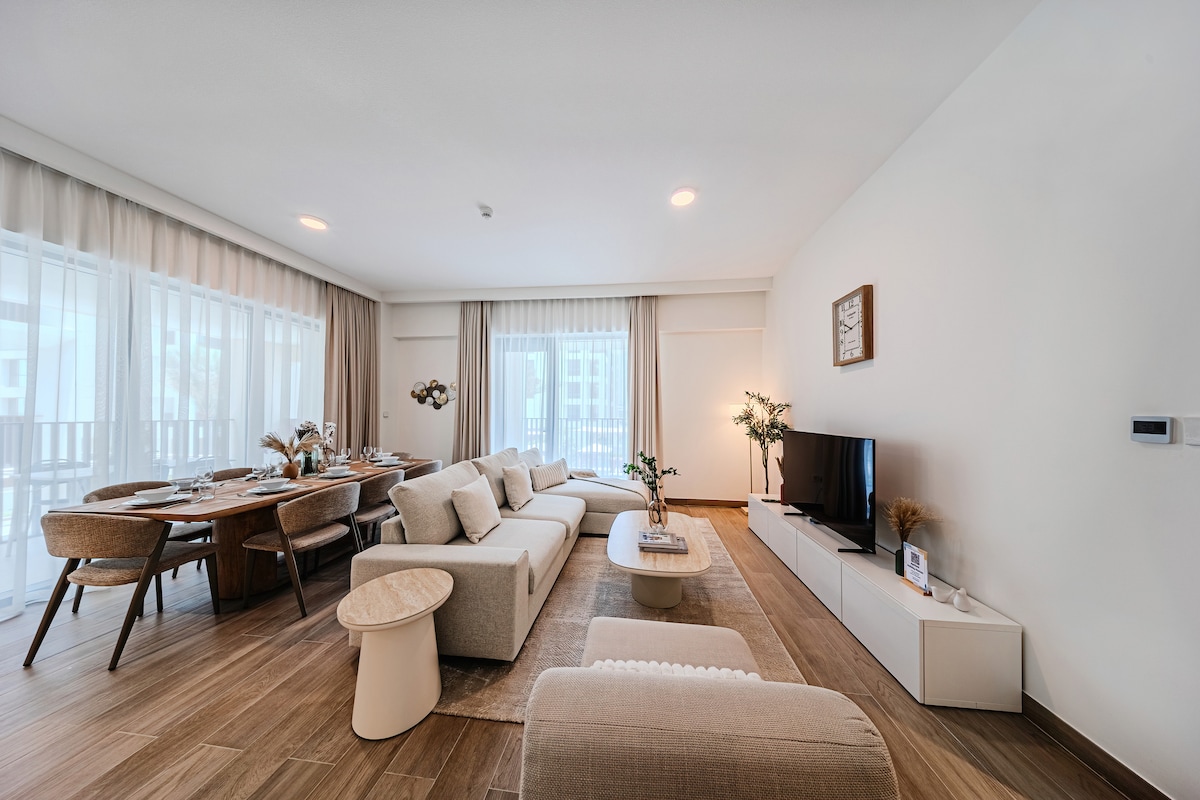 No Smoking 🚭 No Pets 🐱🐶 🚫 Enjoy minimalist comfort surrounded by lush walkways, vibrant dining, and top city specialty coffee shops at Al Jada Avenue. • Property Type: 2-bedroom apartment. • Location: Boulevard 1 – AlJada Avenue. • Amenities: Queen bed, twin bed, smart TV, WiFi, fully equipped kitchen, modern bathroom, floor-to-ceiling windows, gym, pool, and a secure entry Relax with the whole family at this peaceful place.