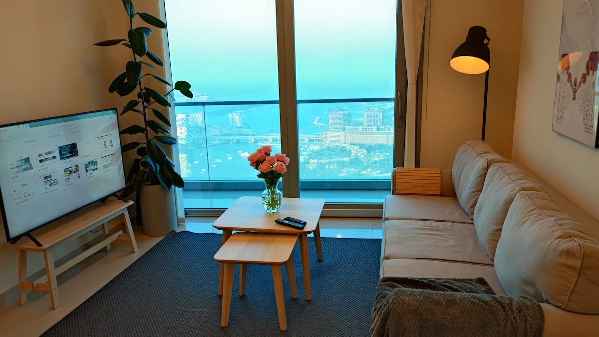 Escape to this cozy 30th-floor retreat with breathtaking panoramic views of Dubai's skyline, coastline, and landmarks like the Burj Khalifa. This luxurious home features a plunge pool on the balcony, modern interiors, and a serene atmosphere. Thoughtfully equipped for a seamless, relaxing stay for two, it's the perfect elevated escape in the heart of the city.