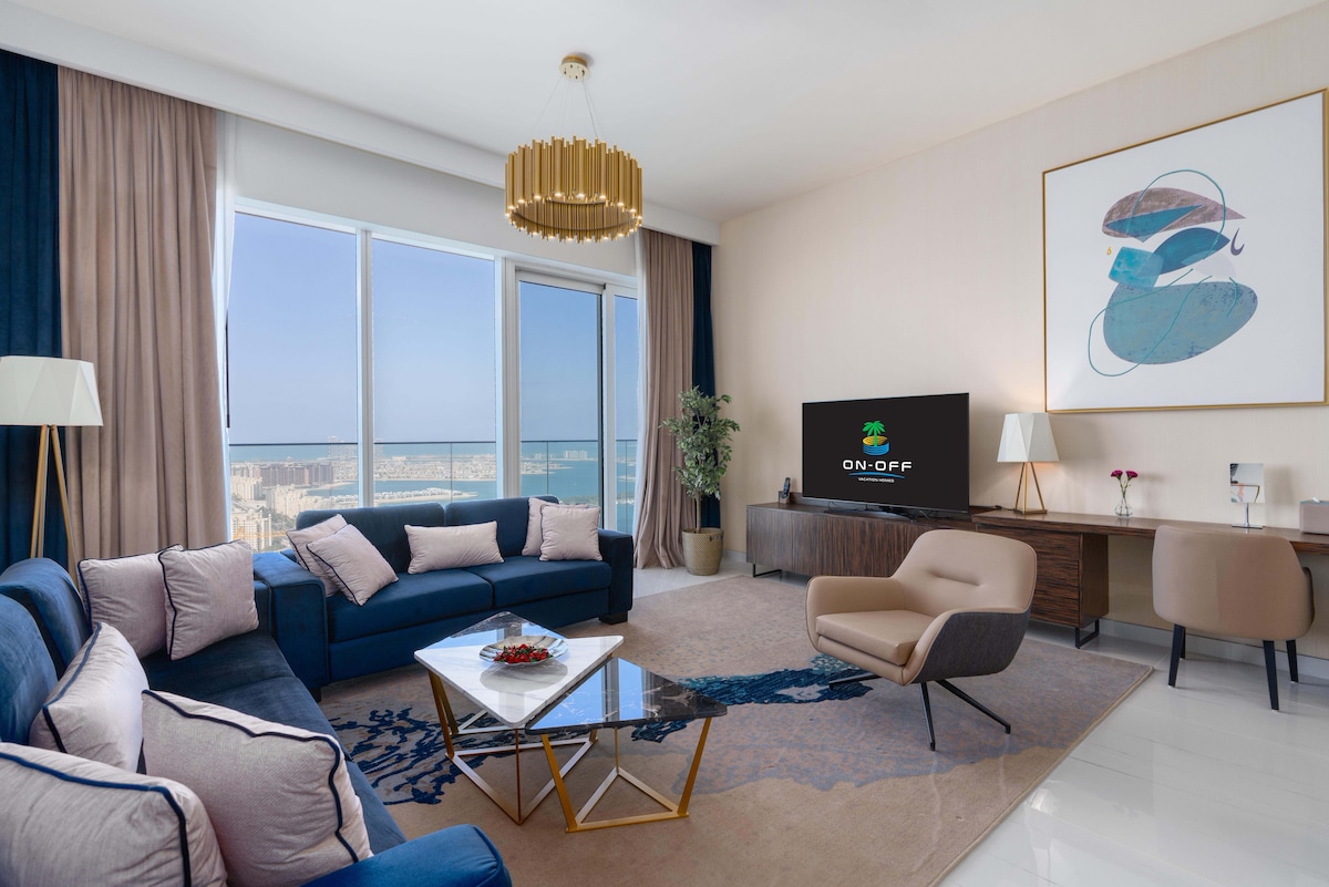 Perfect stay in a modern 2-bedroom apartment with huge balcony and spectacular sea views. This apartment is very spacious (2150 sq.ft!) and has everything you need to relax & enjoy your trip! Free access for all guests to outdoor pool and pristine beach line. All within 3 minutes walk! Palm Jumeirah has it all - panoramic promenades, dancing fountains, restaurants, shopping malls, entertainments for kids & adults, and much more. Ideal destination for families, friends and business travellers!