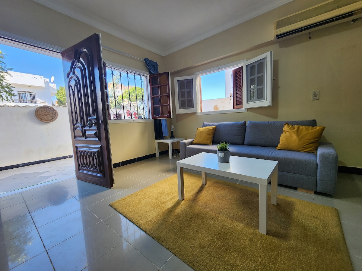 Cozy 1-bedroom apartment in the heart of Hadaba, Sharm El Sheikh. Ground floor with 2 balconies, high-speed WiFi, A/Cs, TV, sofa bed, washing machine, full kitchen. Secured villa with parking. Walk to shops, restaurants, gym, and transport. Close to sandy & coral beaches. Rooftop access with beautiful sunsets. No smoking indoors! Ideal for couples or solo travelers seeking sun and relaxation.