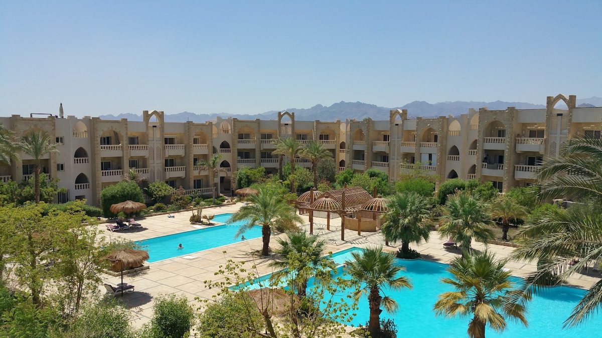 First time to rent new apartment,Studio first floor in delta Sharm Resort, with amazing view, natural, gardens views,swimming pools, security, privacy, quiet, jacuzzi, parking, market, salon, pharmacy, cafe, restaurants , tracks, good community all u need and all u deserve .. For lovely people how wants stay for short term in good clean resort
