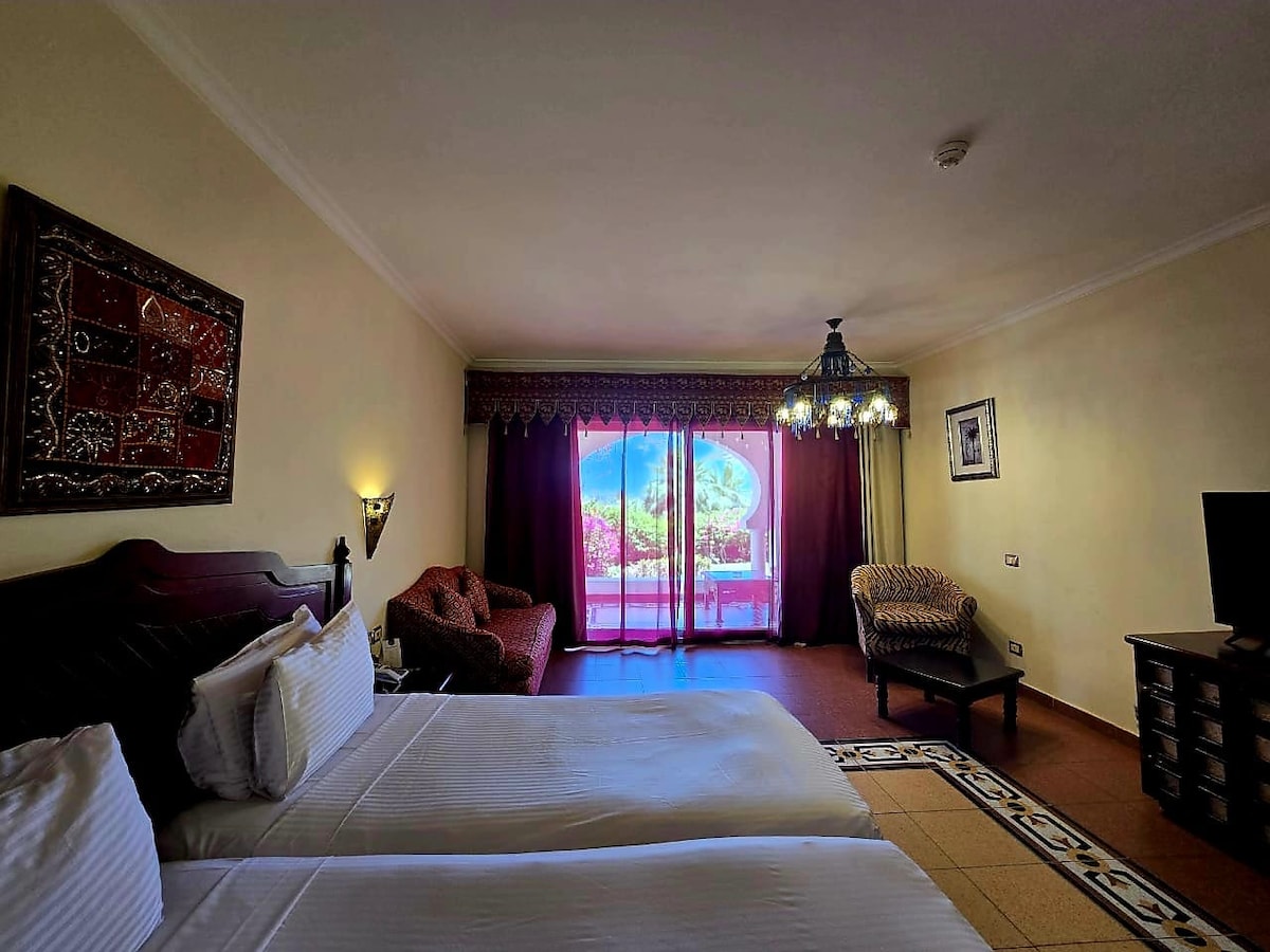 Come and experience the best of your vacation at our furnished hotel studio with pool & sea view in Domina Coral Bay Resort (5*) in Sharm El Sheikh It includes 2 single beds, 2 sofa beds, a bathroom, bed linen, towels, a TV, a small kitchen, and a terrace with a mosquito net. A 2 km beach, 7 swimming pools, a 5,000 m Salt Lake, a gym with a sea view, water sports & entertainment. The studio is 9km from the airport, 10 minutes from SOHO Square & Nemaa Bay; Ras Mohd Park is 20-25 km away.