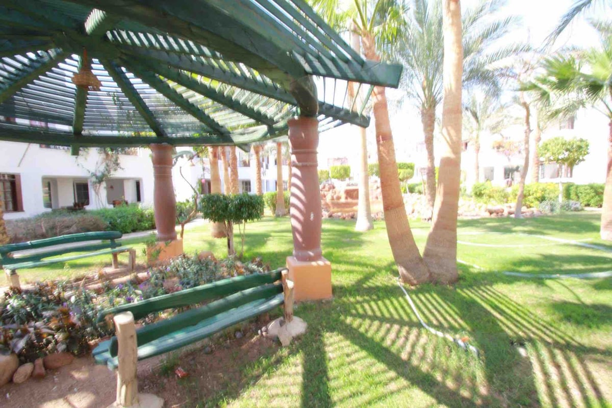 Cosy Studio inside luxury compound with 8 swimming big pools very close to Naama Bay heart of city * Ground floor with private entrance and big terrace * High speed Wi-Fi , equipped kitchen, flat HD Screen, air condition * 1 mile to the amazing Seashore of Naama Bay. * free parking is available right front of studio * 24 hours supermarket with delivery * Direct Access to public transportation you will have your own private sunny large patio
